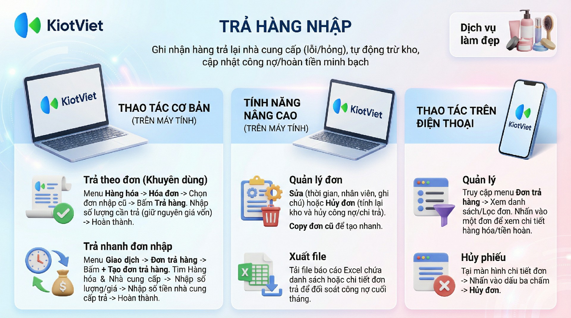 Trong quá trình kinh doanh Spa/Salon, không tránh khỏi các trường hợp nhập hàng về nhưng phát hiện sản phẩm bị lỗi (vỡ lọ tinh chất, máy móc hỏng), hàng cận date, hoặc nhà cung cấp giao sai mã màu (thuốc nhuộm, sơn móng). Tính năng Trả hàng nhập giúp bạn ghi nhận việc trả lại hàng hóa cho nhà cung cấp, tự động trừ tồn kho và cập nhật lại công nợ chính xác.