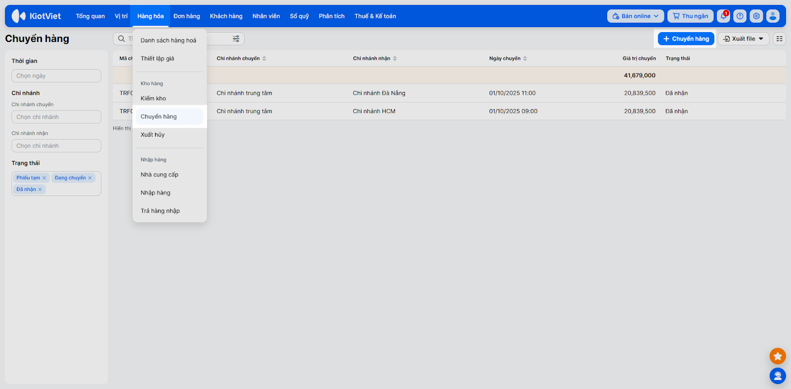 - Vào menu Hàng hóa → chọn Chuyển hàng.