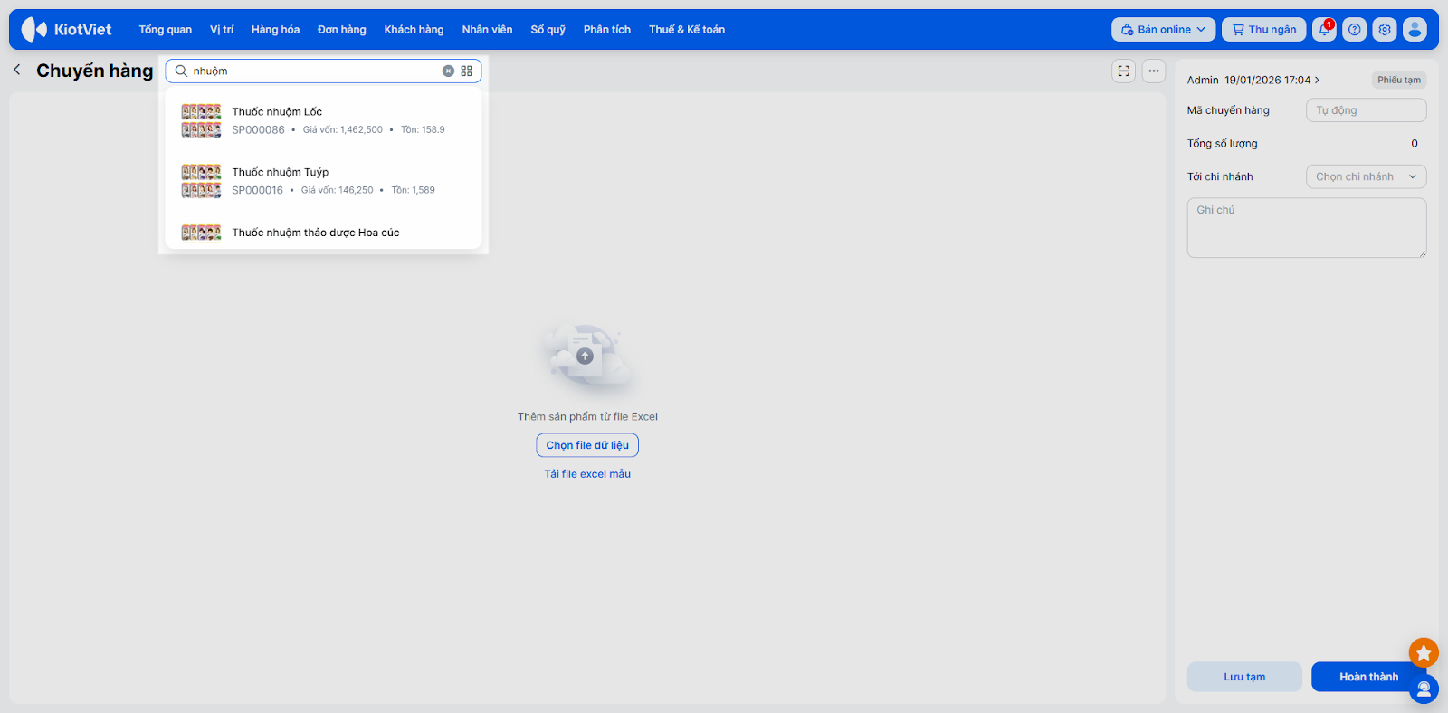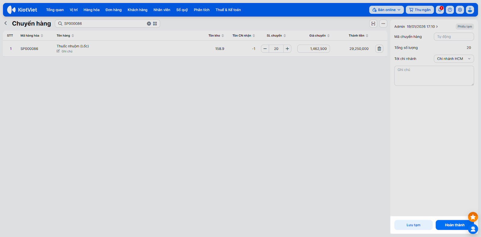 Đối với các hệ thống Salon có nhiều chi nhánh, việc luân chuyển mỹ phẩm (dầu gội, thuốc nhuộm…), vật tư tiêu hao hoặc thiết bị máy móc từ cơ sở này sang cơ sở khác diễn ra thường xuyên. Tính năng Chuyển hàng giúp bạn quản lý chặt chẽ số lượng hàng đi và hàng đến, đảm bảo kho hàng luôn khớp với thực tế.