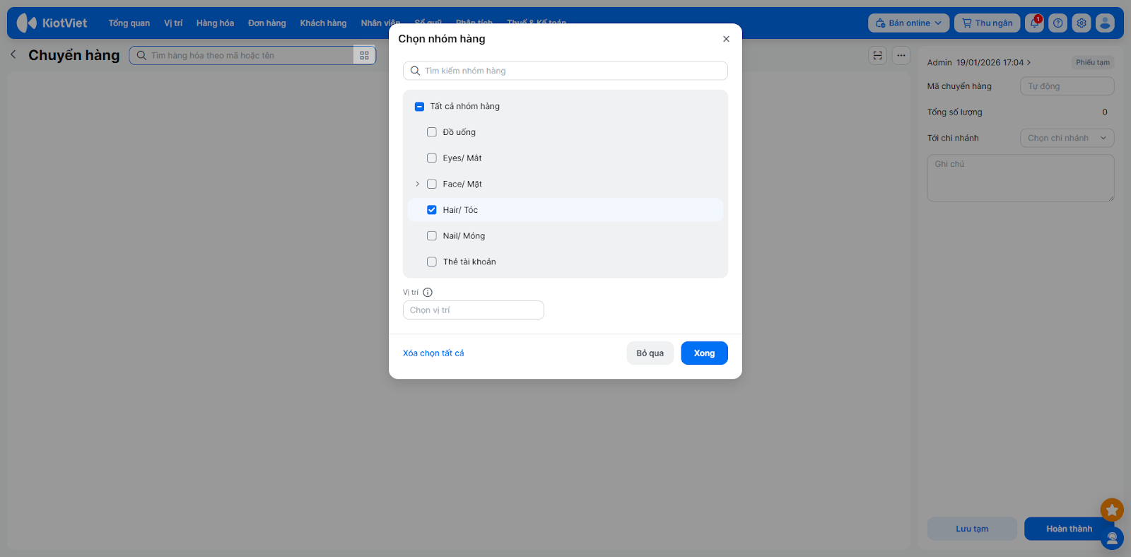 - Cách 2 (Chọn theo nhóm hàng): Bạn nhấn vào biểu tượng nhóm hàng → tích chọn nhóm cần chuyển hàng → chọn Xong.