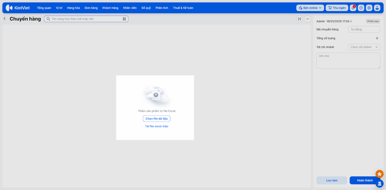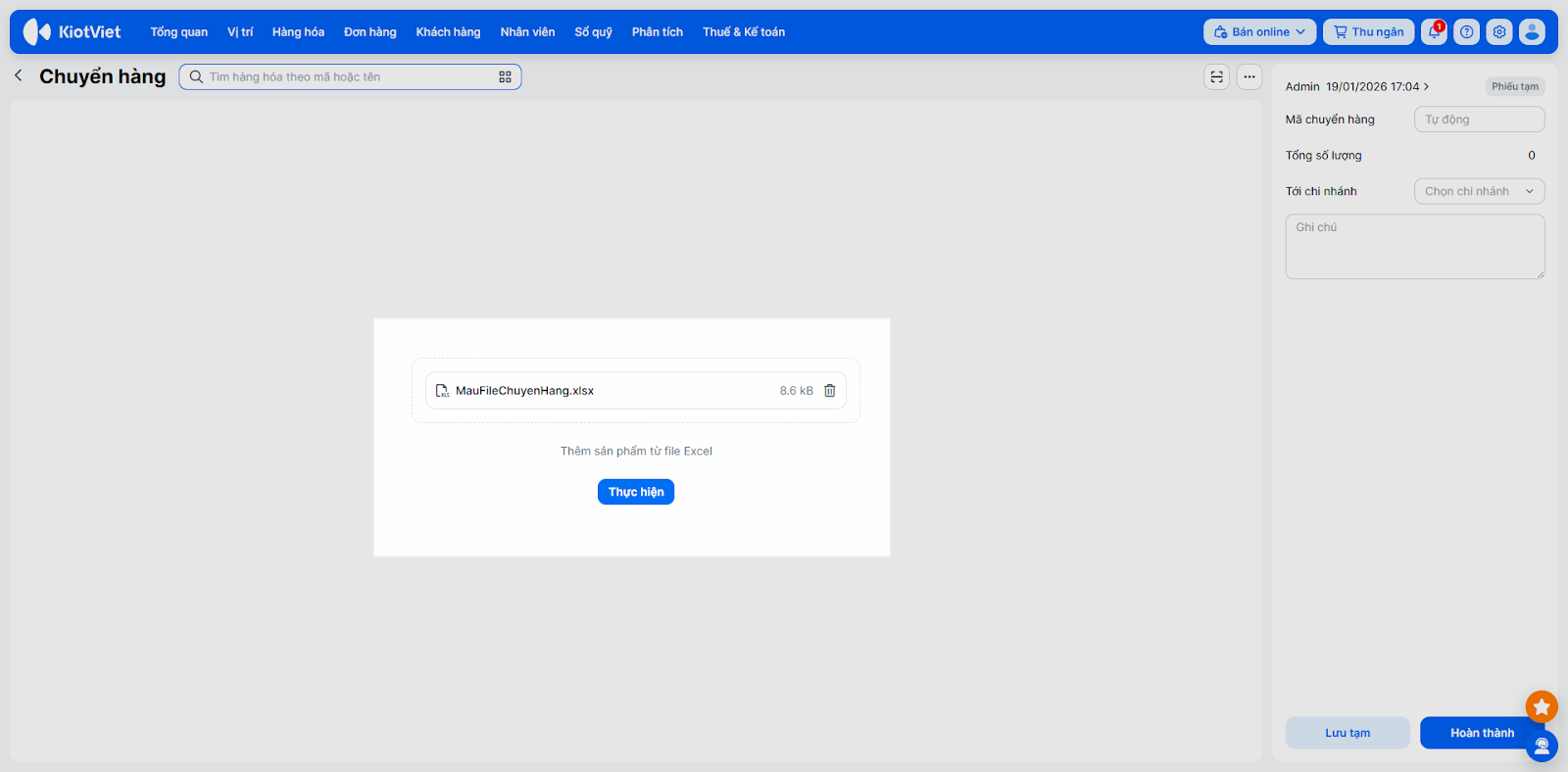 - Cách 3 (Import Excel): Kích Tải file excel mẫu, điền thông tin Mã hàng, Số lượng, Giá chuyển, sau đó nhấn Chọn file dữ liệu → chọn Thực hiện để tải lên hệ thống.