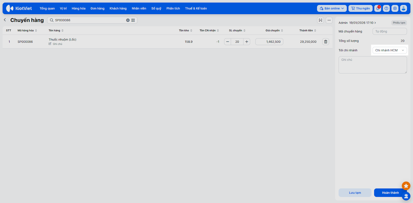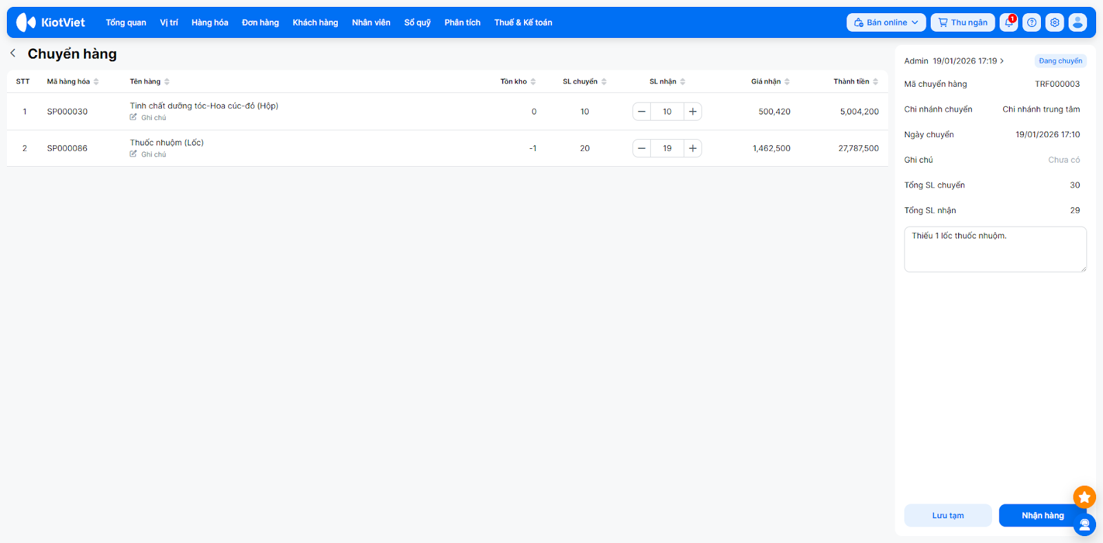 - Nếu thiếu: Nhập đúng số lượng thực tế nhận được → nhập Ghi chú. (Hệ thống sẽ tự động hoàn lại số lượng chênh lệch về kho của chi nhánh chuyển).