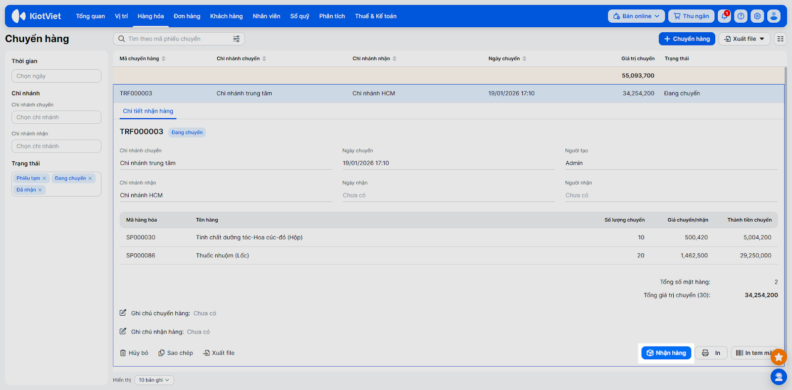 - Tìm phiếu chuyển có trạng thái Đang chuyển và nhấn Nhận hàng.