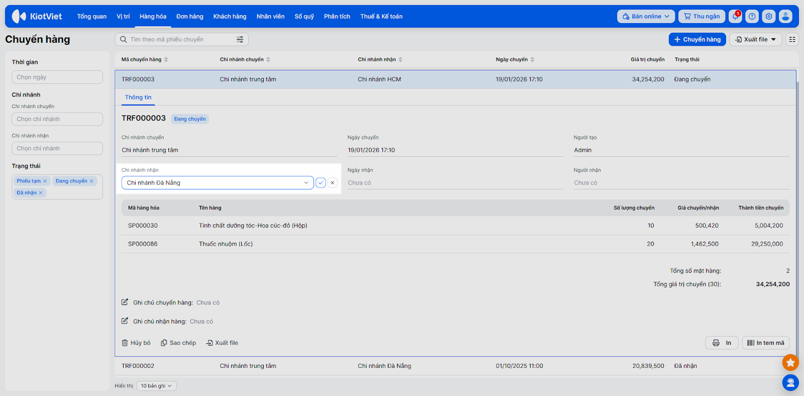 - Hủy phiếu: Chọn phiếu muốn hủy → nhấn Hủy bỏ → xác nhận Hủy phiếu. Khi hủy, tồn kho sẽ được cộng lại cho chi nhánh chuyển và trừ đi ở chi nhánh nhận (nếu phiếu đã được nhận).