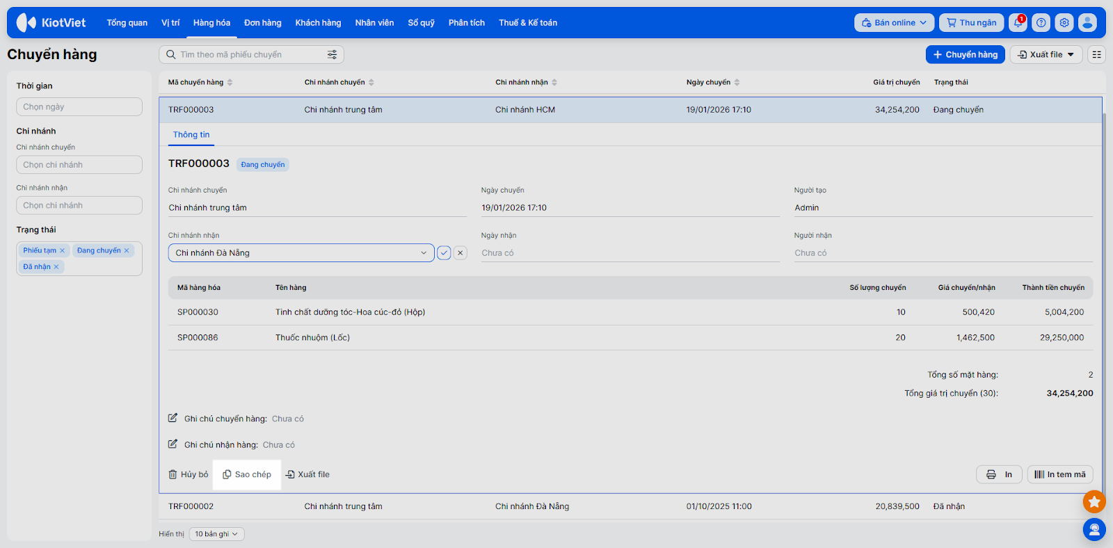 - Sao chép: Chọn phiếu cũ, nhấn Sao chép để tạo nhanh một phiếu mới với thông tin hàng hóa tương tự (Thao tác này chỉ thực hiện được khi bạn đang ở đúng chi nhánh chuyển đi).