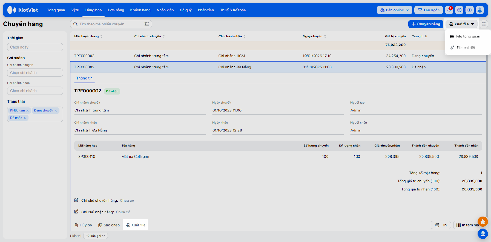 - Xuất file danh sách: Tại màn hình danh sách phiếu chuyển, nhấn Xuất file → chọn File tổng quan (nếu muốn xem danh sách các phiếu) hoặc File chi tiết (nếu muốn xem chi tiết từng sản phẩm trong phiếu) → hệ thống thực hiện xuất file danh sách các phiếu chuyển theo bộ lọc đang chọn trên màn hình.