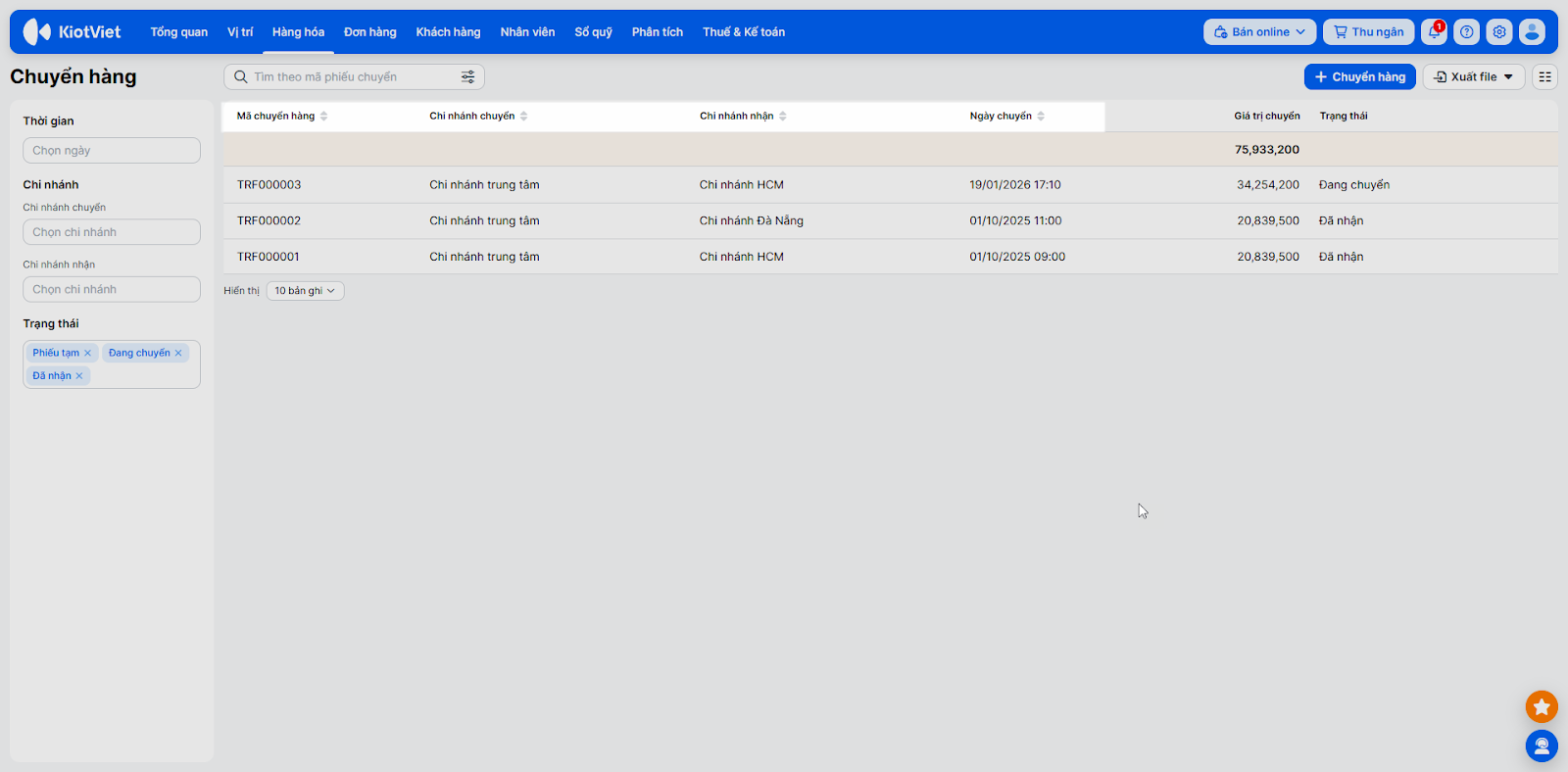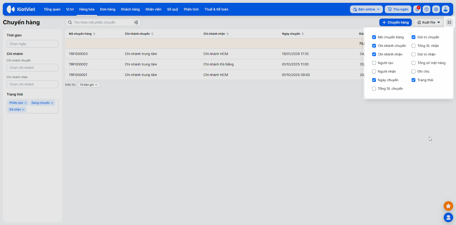 - Sắp xếp: Kích vào tiêu đề các cột (Ngày chuyển, Chi nhánh…) để sắp xếp danh sách tăng dần hoặc giảm dần.