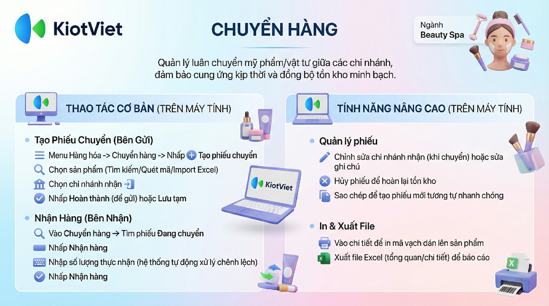 - Kiểm soát thất thoát: Giúp chủ Salon hoặc quản lý kiểm soát chính xác lượng mỹ phẩm, vật tư tiêu hao luân chuyển giữa các chi nhánh, tránh thất thoát.