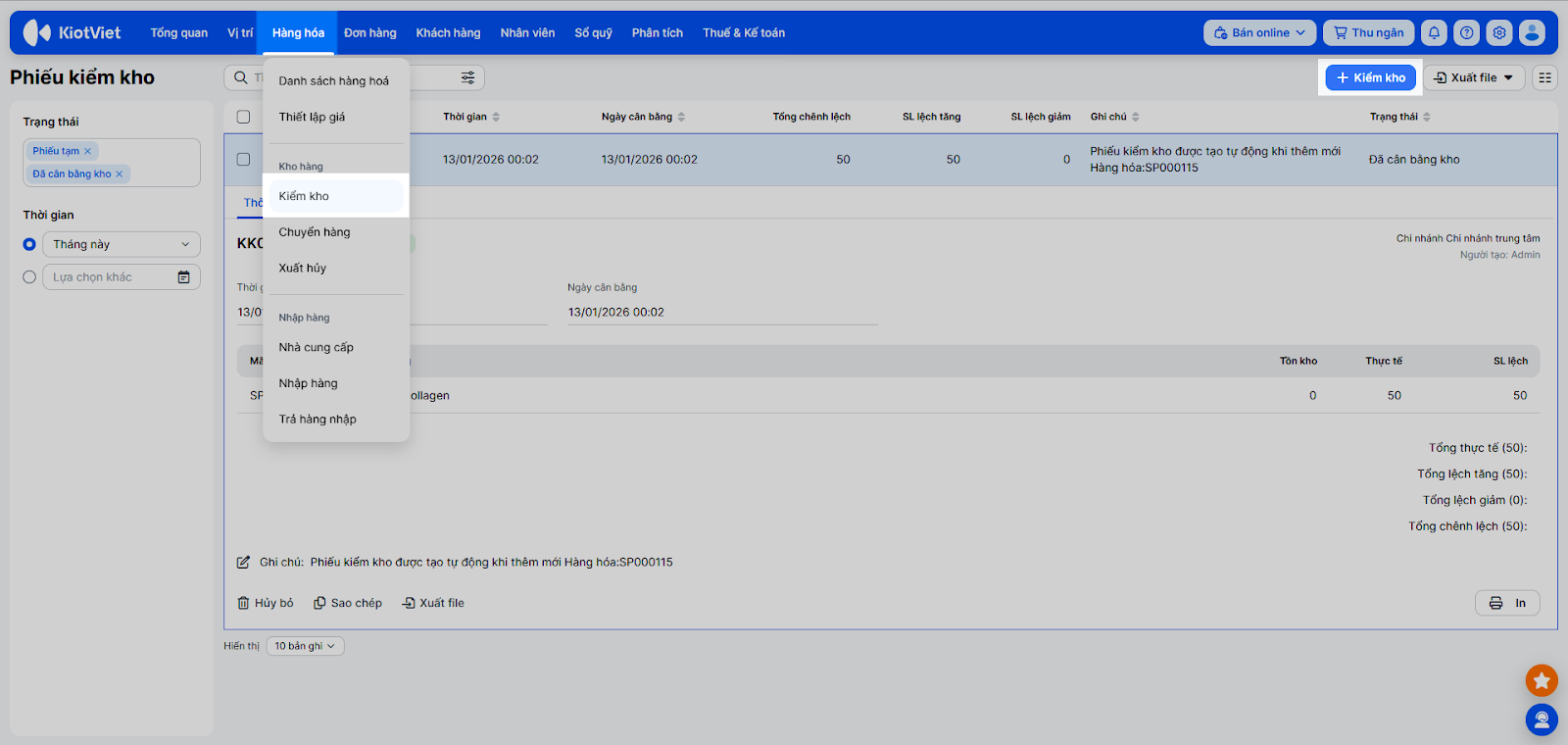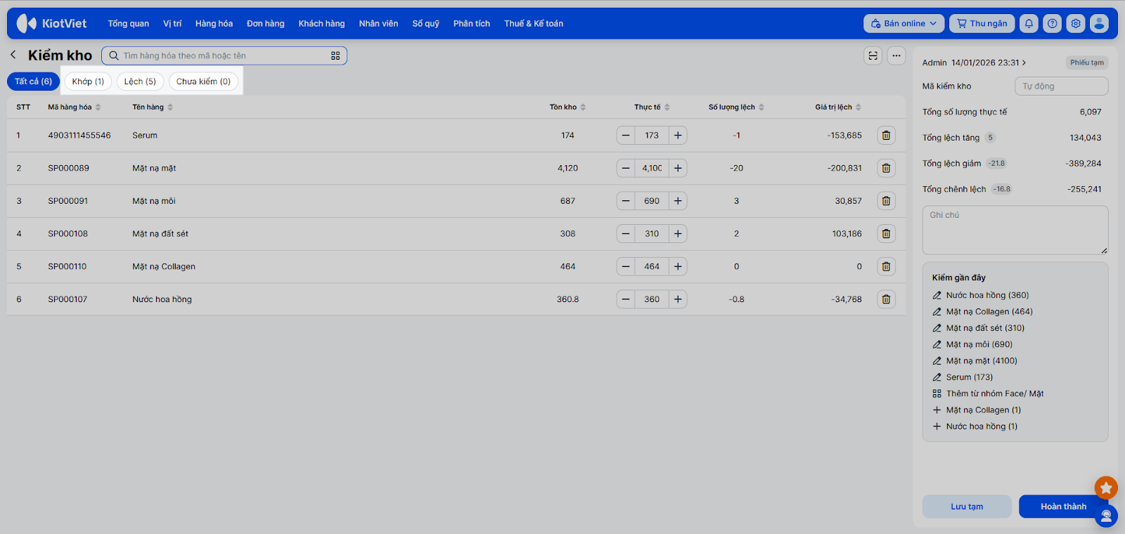 - Tình huống: Sau khi nhập xong số liệu, bạn cần kiểm tra lại các mặt hàng bị lệch trước khi chốt sổ.