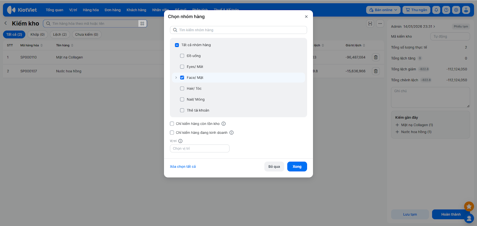 - Chọn nhóm hàng cụ thể (Ví dụ: Chỉ kiểm kê nhóm Face/ Mặt).