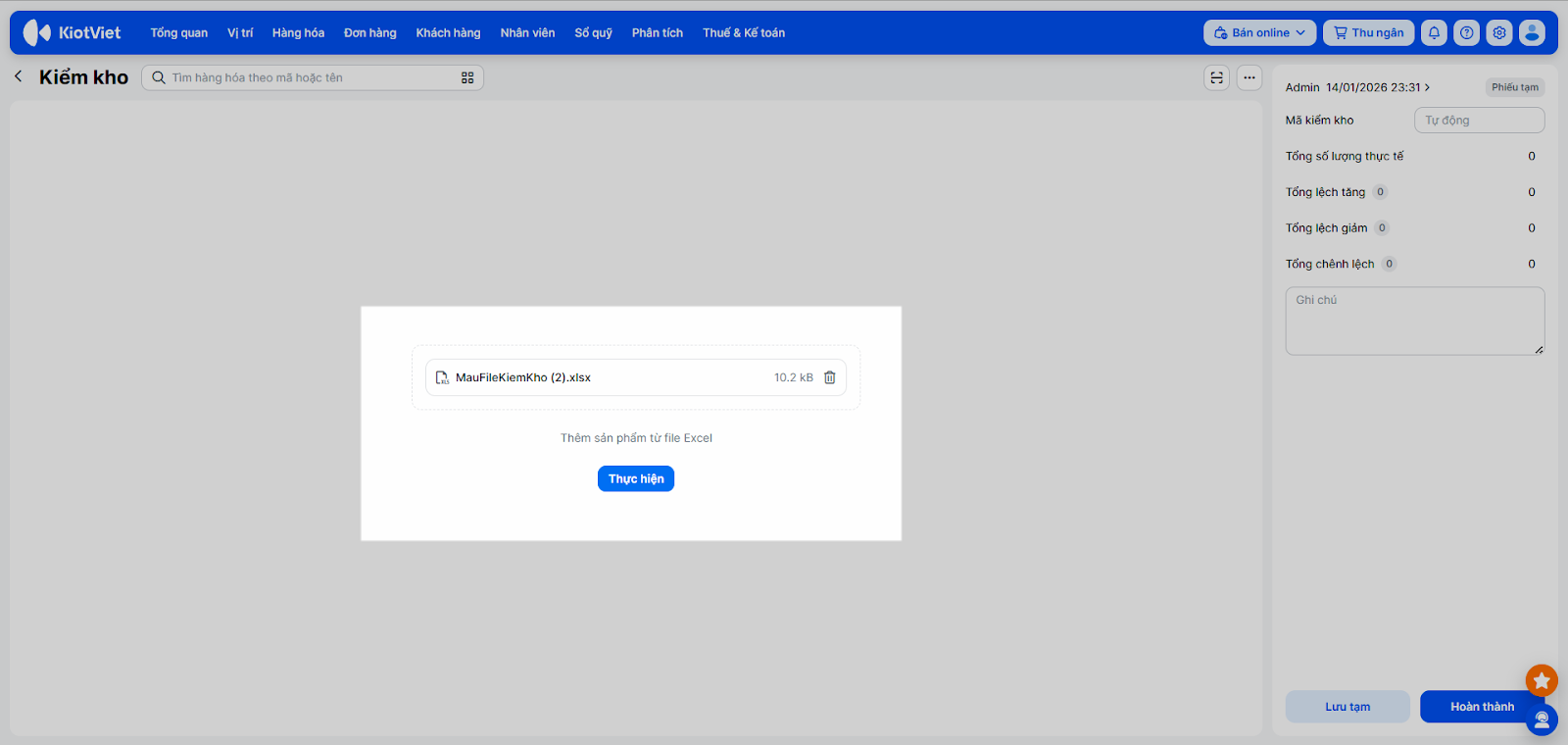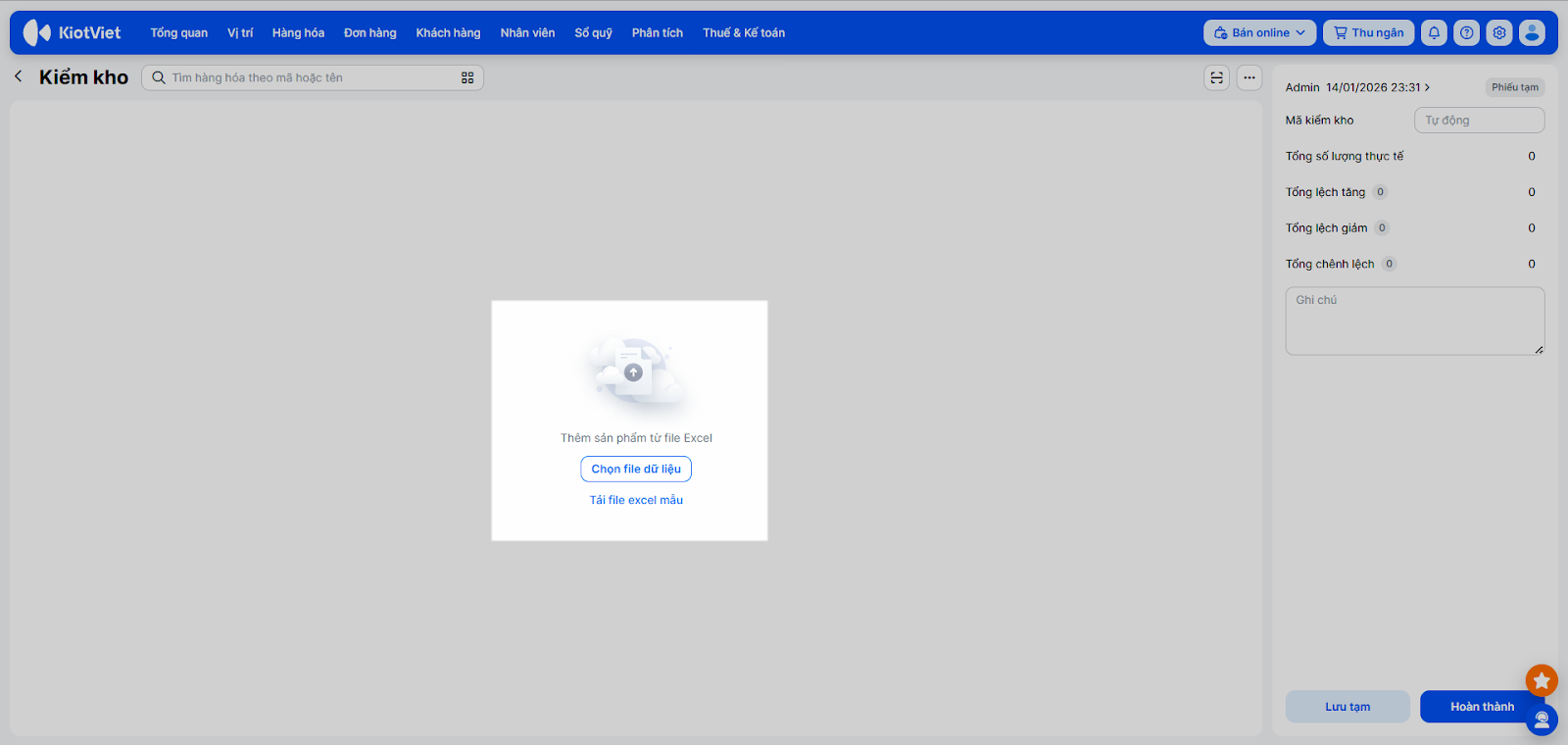 - Tải về file mẫu, điền số lượng thực tế rồi tải ngược lên hệ thống. Cách này phù hợp khi bạn cần kiểm kho tổng thể toàn bộ cửa hàng.