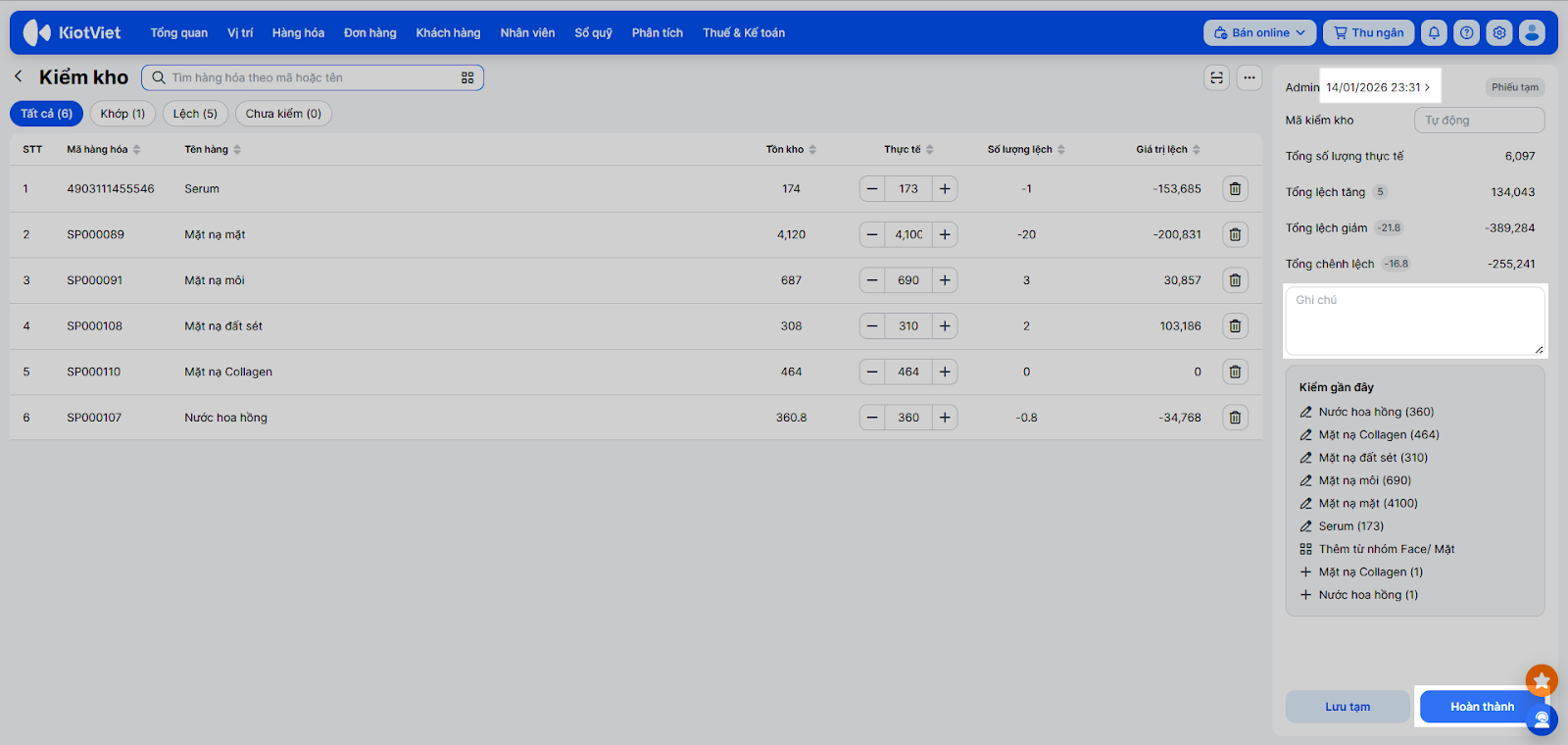 - Nhấn Hoàn thành để cân bằng kho. Lúc này tồn kho trên phần mềm sẽ được cập nhật theo số thực tế bạn vừa nhập. (Nếu chưa kiểm xong, bạn có thể nhấn Lưu tạm để tiếp tục xử lý sau).