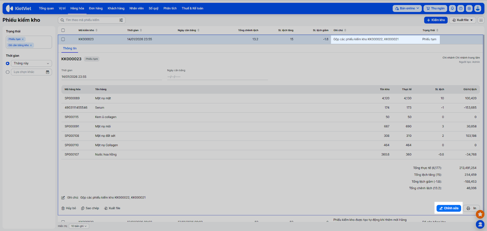 - Kiểm tra lại số liệu trên phiếu tổng và nhấn Chỉnh sửa → Hoàn thành phiếu để cân bằng kho.