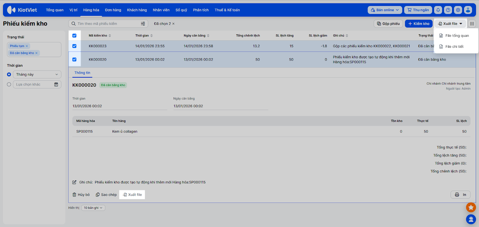 - Trên danh sách Phiếu kiểm kho → bạn tích chọn các phiếu kiểm cần xuất → chọn Xuất file → chọn File tổng quan hoặc File chi tiết.