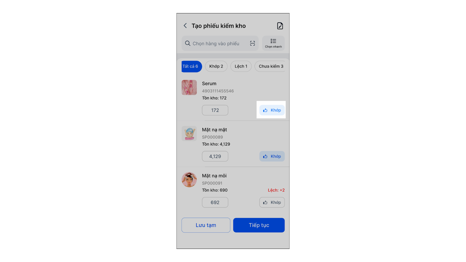 - Nếu số lượng thực tế khớp với số lượng trên phần mềm, bạn chỉ cần nhấn Khớp