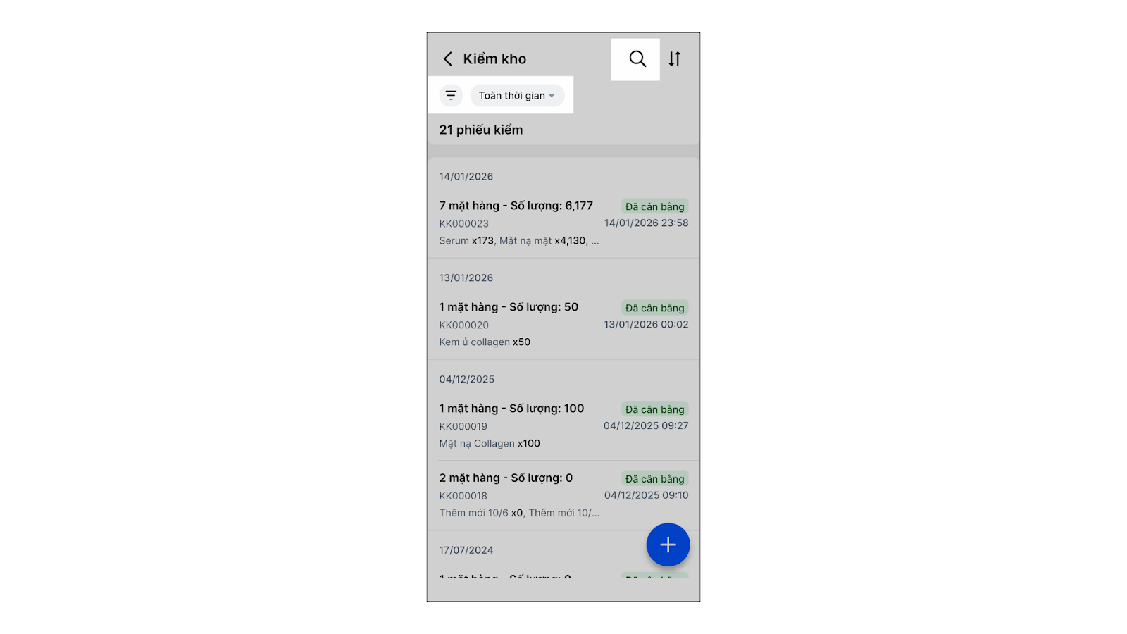 - Tại đây bạn có thể tìm kiếm theo mã phiếu, hàng hóa hoặc sử dụng bộ lọc trạng thái, thời gian để tìm phiếu kiểm.
