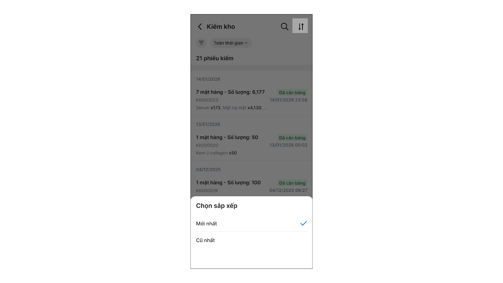 - Xem chi tiết: Trên màn hình Kiểm kho, bạn chạm vào phiếu cần xem thông tin.
