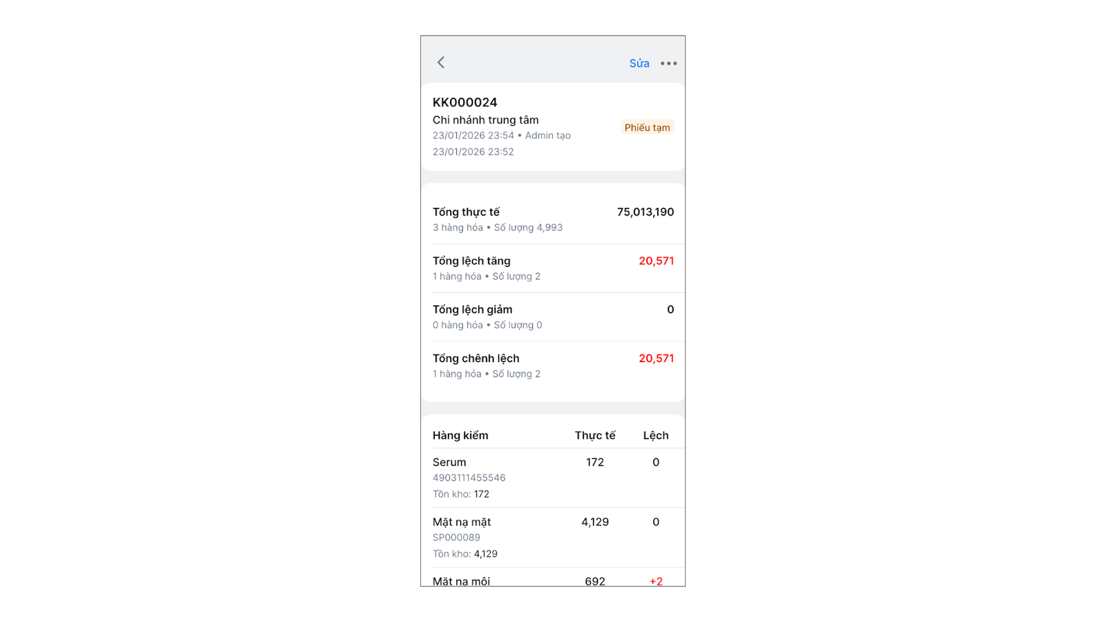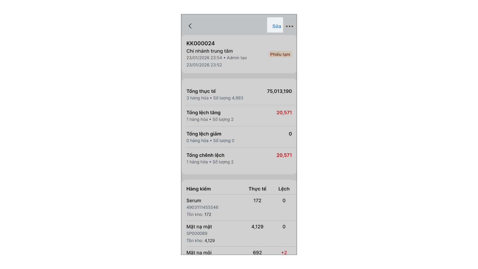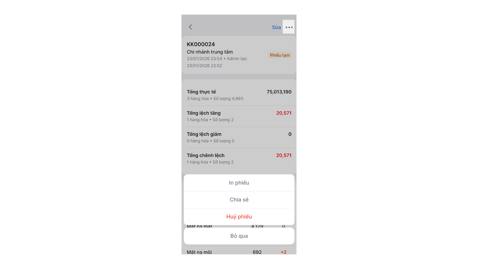 - Tình huống: Bạn cần xem phiếu kiểm, chỉnh sửa, hủy hoặc in một phiếu kiểm kho ngay trên ứng dụng di động.