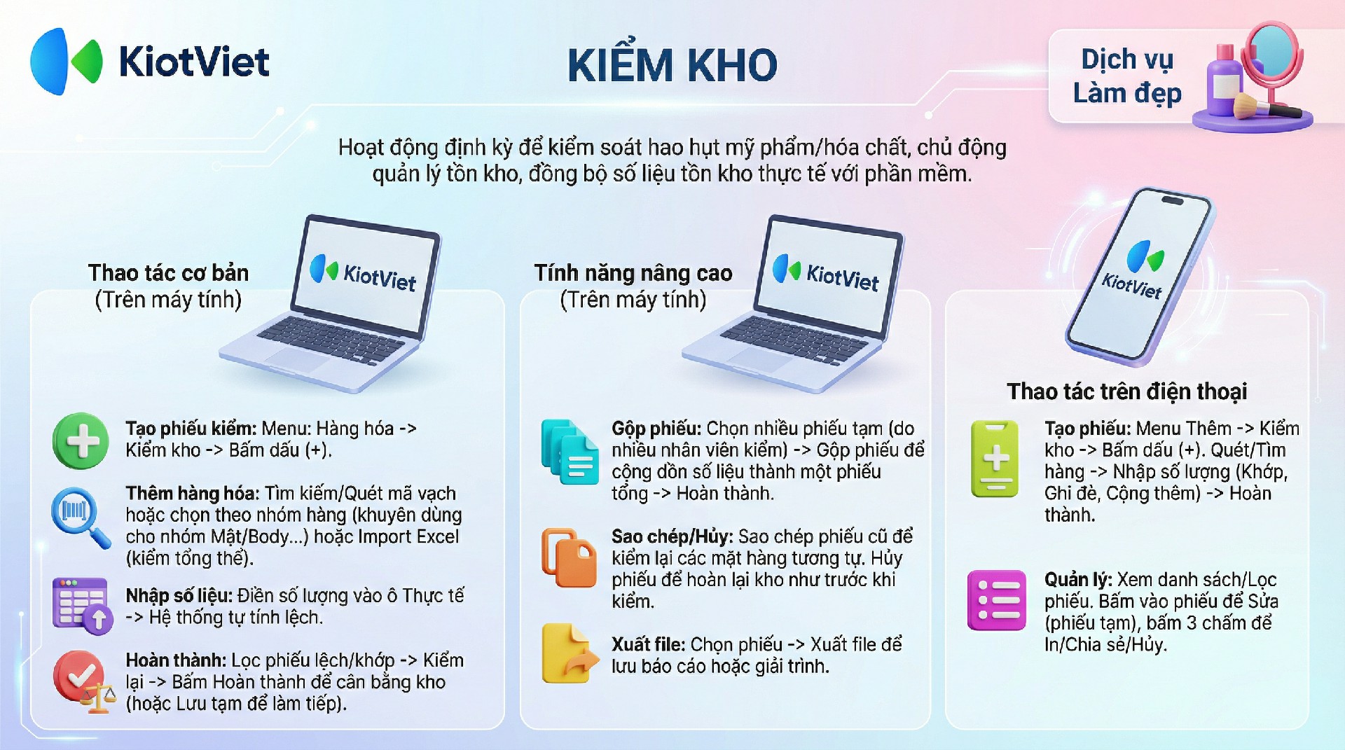 Kiểm kho là hoạt động định kỳ (tuần/tháng) giúp chủ Salon nắm bắt chính xác số lượng thực tế của mỹ phẩm, hóa chất (thuốc nhuộm, uốn, duỗi) và vật tư tiêu hao tại cửa hàng so với số liệu trên phần mềm.