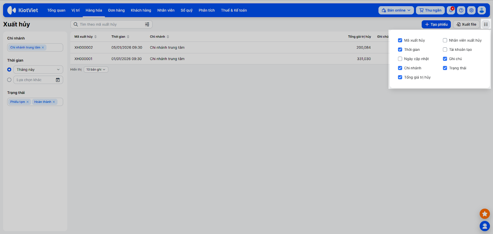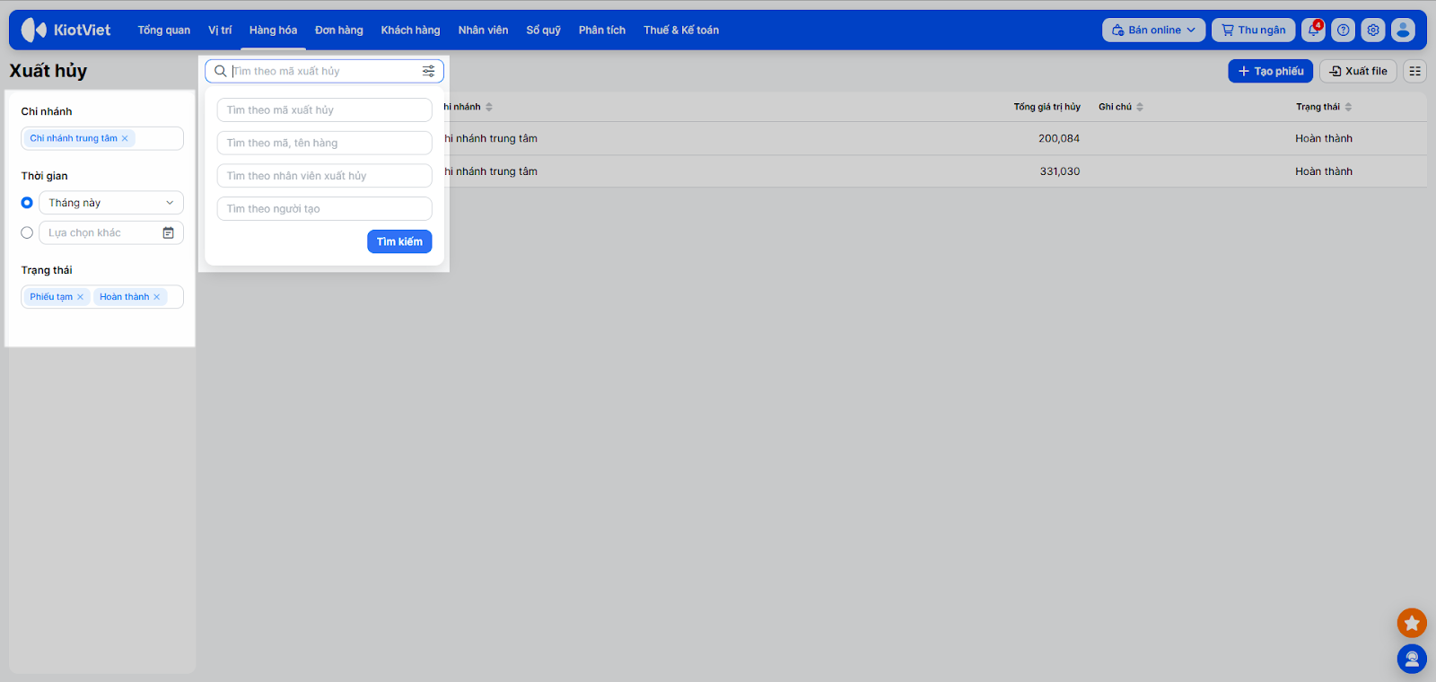 - Tìm kiếm: Tại màn hình danh sách Xuất hủy, sử dụng bộ lọc bên trái để tìm theo: Mã xuất hủy; Mã, tên hàng hóa; Nhân viên xuất hủy; Người tạo; Chi nhánh; Thời gian hoặc Trạng thái.