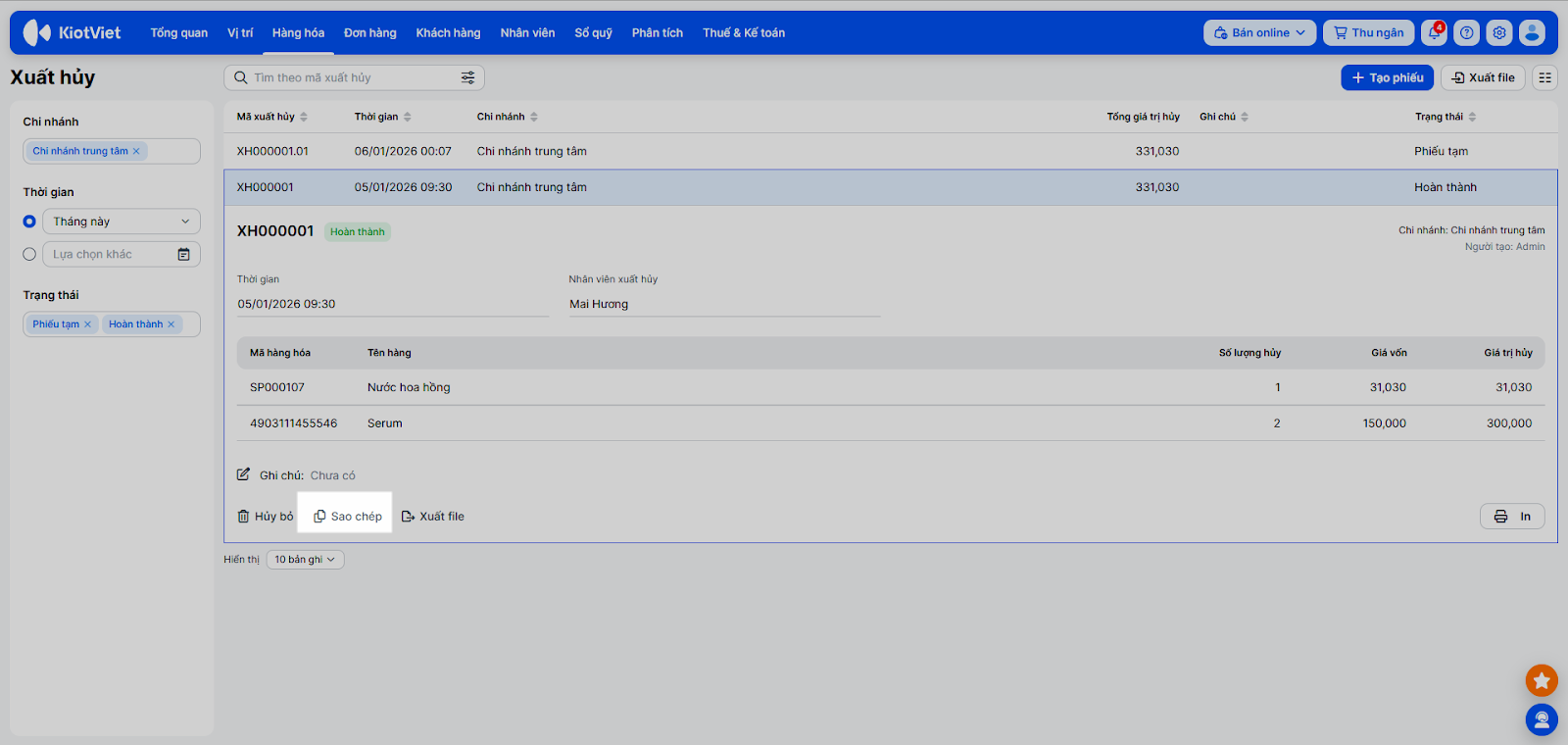 - Vào Hàng hóa → Xuất hủy, chọn phiếu xuất hủy cũ cần sao chép.