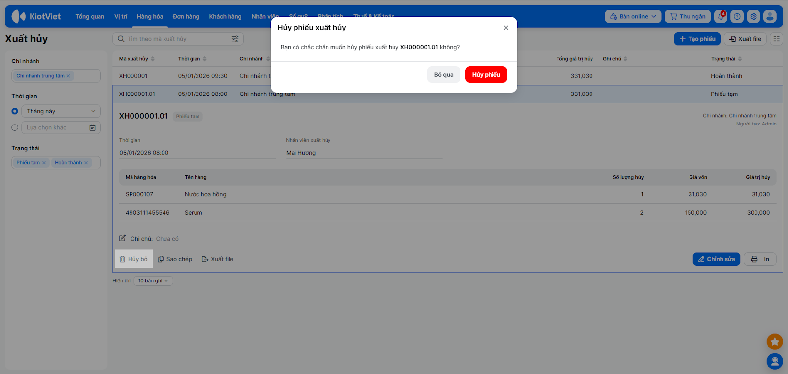 - Hủy phiếu: Vào Hàng hóa → Xuất hủy, chọn phiếu cần hủy bỏ, bấm Hủy bỏ → xác nhận Hủy phiếu. Hệ thống sẽ cộng lại tồn kho cho các hàng hóa trong phiếu đã hoàn thành (coi như chưa từng xuất hủy).