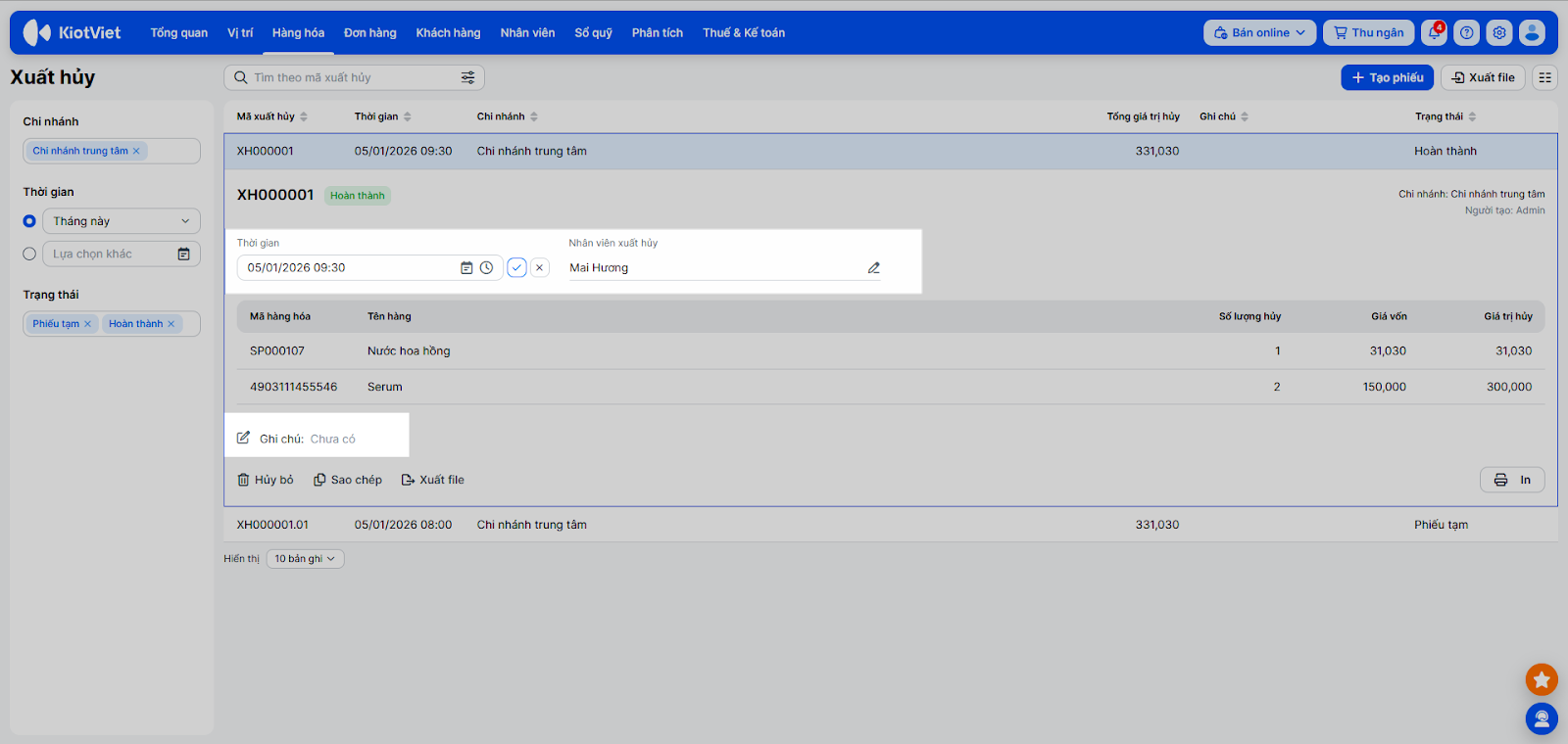 - Với phiếu xuất hủy có trạng thái phiếu tạm, bạn có thể Chỉnh sửa tất cả các thông tin trên phiếu.