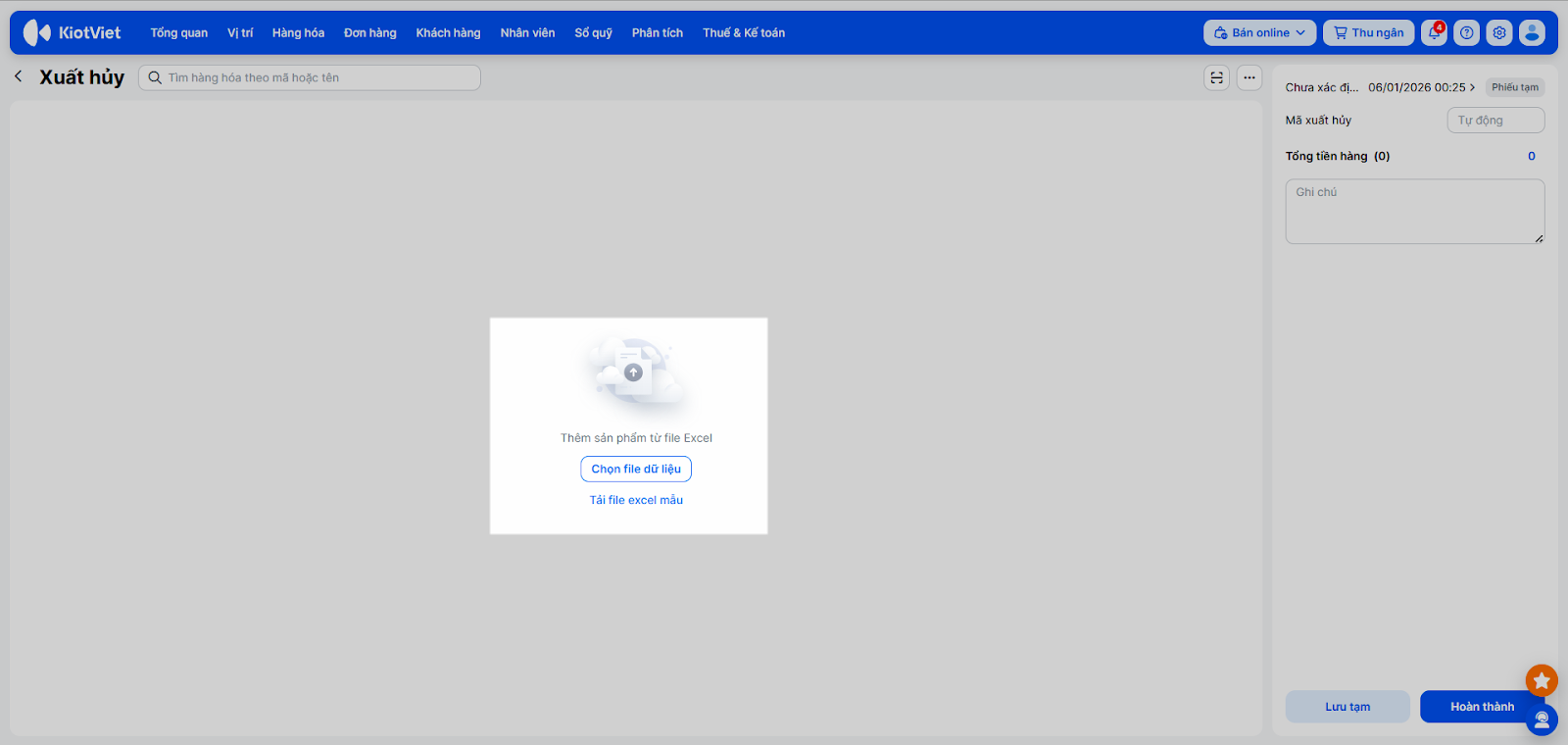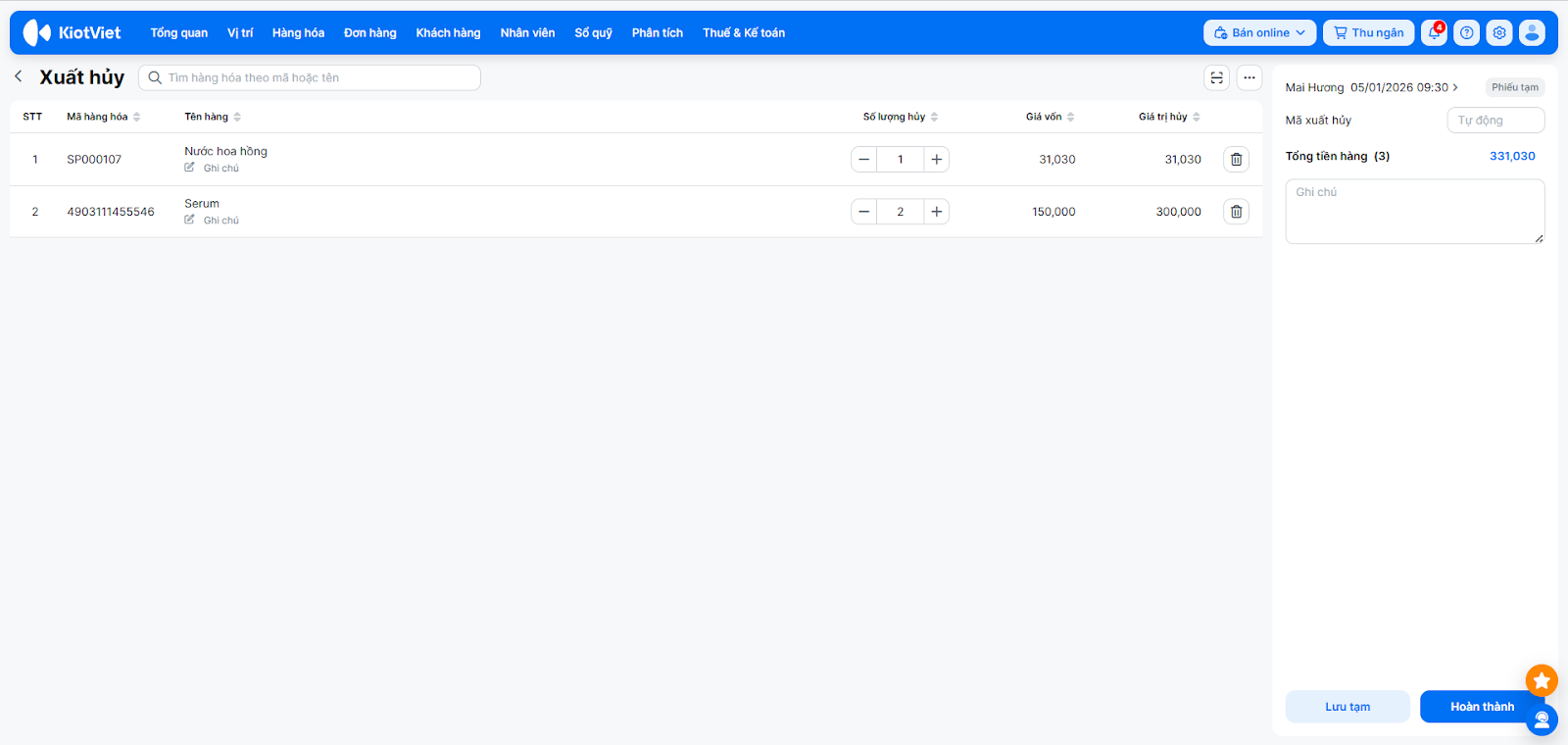 - Kiểm tra lại thông tin và nhấn Hoàn thành để trừ kho ngay lập tức, hoặc Lưu tạm nếu chưa muốn trừ kho ngay.