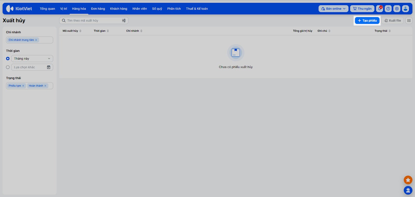 - Trên màn hình Xuất hủy, kích chọn + Tạo phiếu.