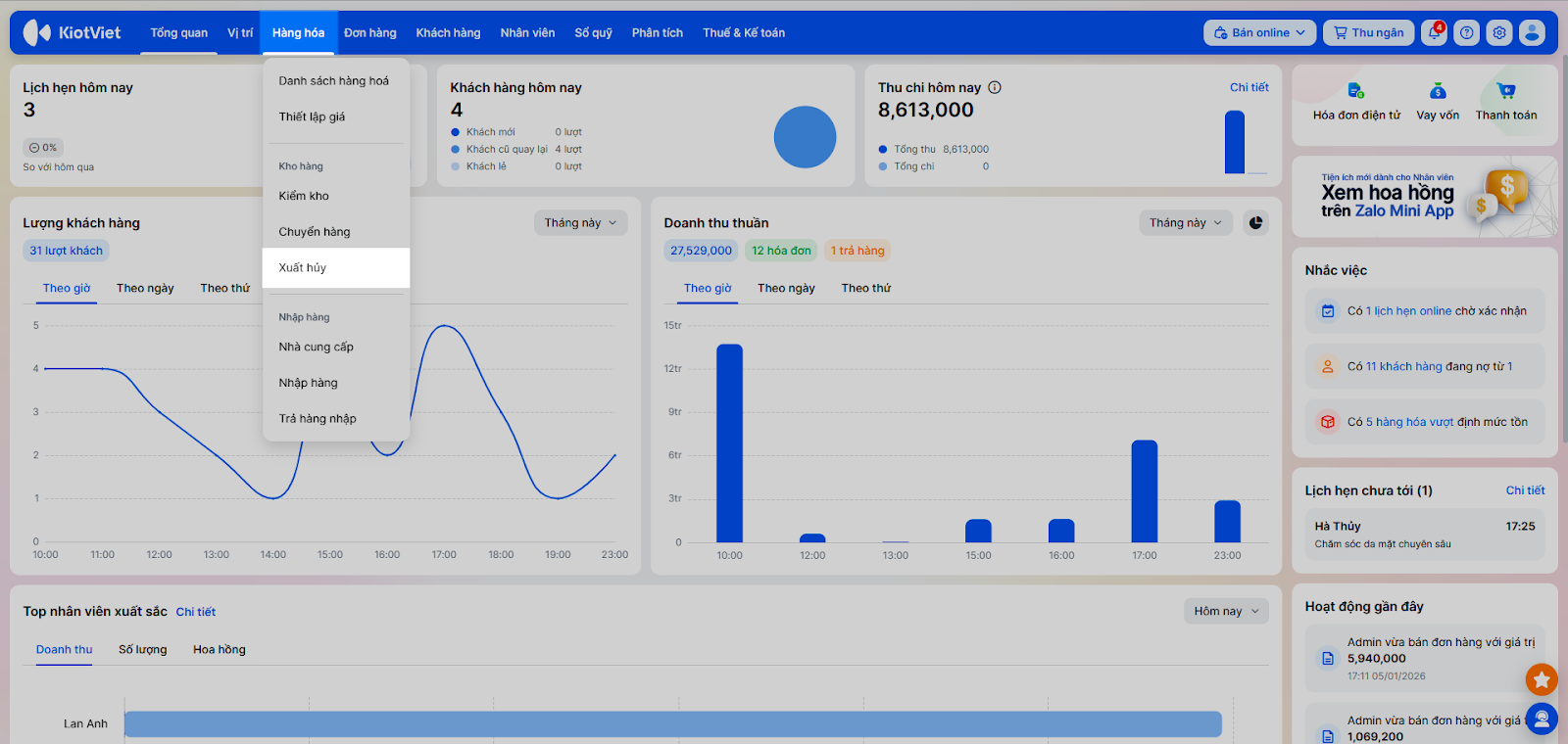 - Kiểm soát thất thoát: Theo dõi được lịch sử, nhân viên thực hiện và lý do hủy hàng để có biện pháp quản lý phù hợp.