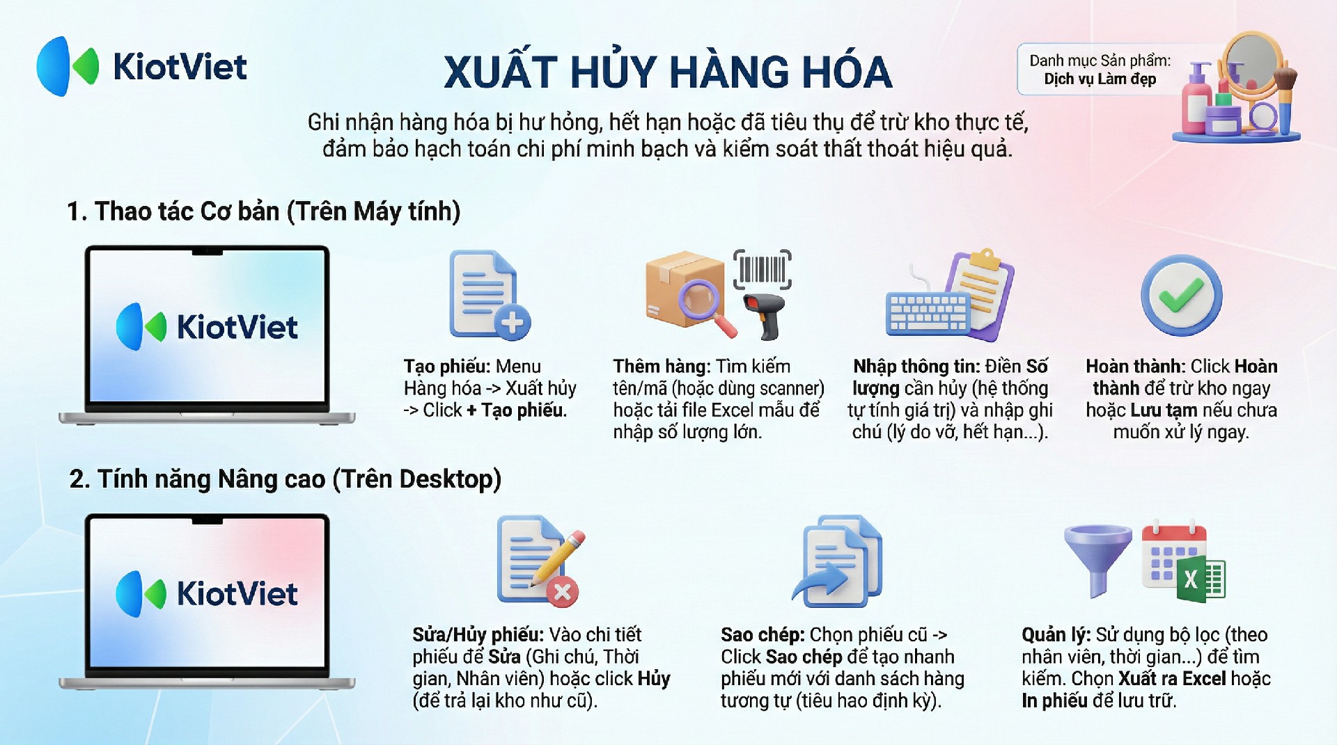 Đối với các Spa, Salon tóc hoặc Nail, trong quá trình vận hành sẽ không tránh khỏi việc các sản phẩm (mỹ phẩm, thuốc nhuộm, dầu gội…) bị hư hỏng, đổ vỡ, hết hạn sử dụng hoặc tiêu hao mà không thể trả lại nhà cung cấp. Hệ thống hỗ trợ chức năng Xuất hủy giúp bạn ghi nhận việc giảm trừ kho hàng thực tế và hạch toán chi phí này vào báo cáo tài chính.