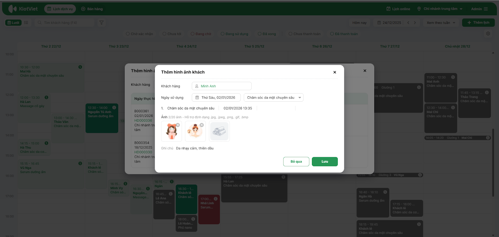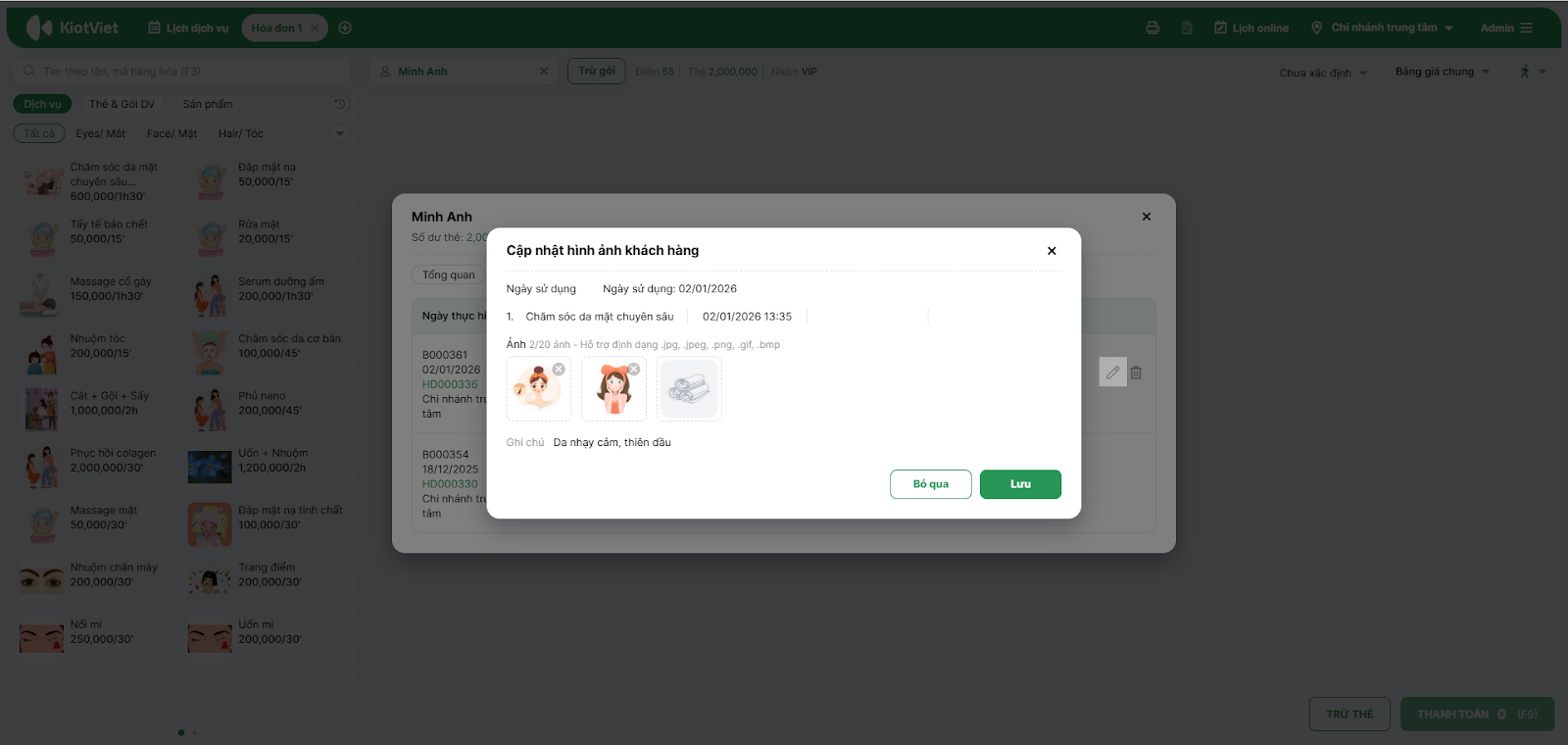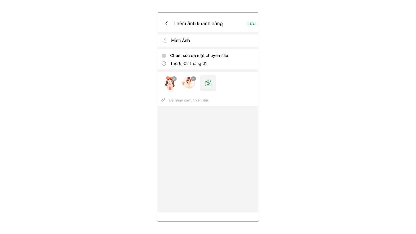 - Nhập Ghi chú nếu cần (Ví dụ: “Ảnh sau buổi điều trị thứ 3”, “Màu nhuộm nâu tây ánh rêu”).