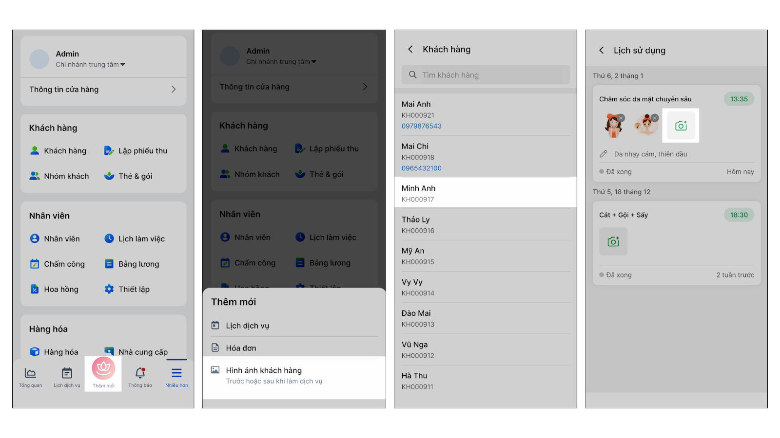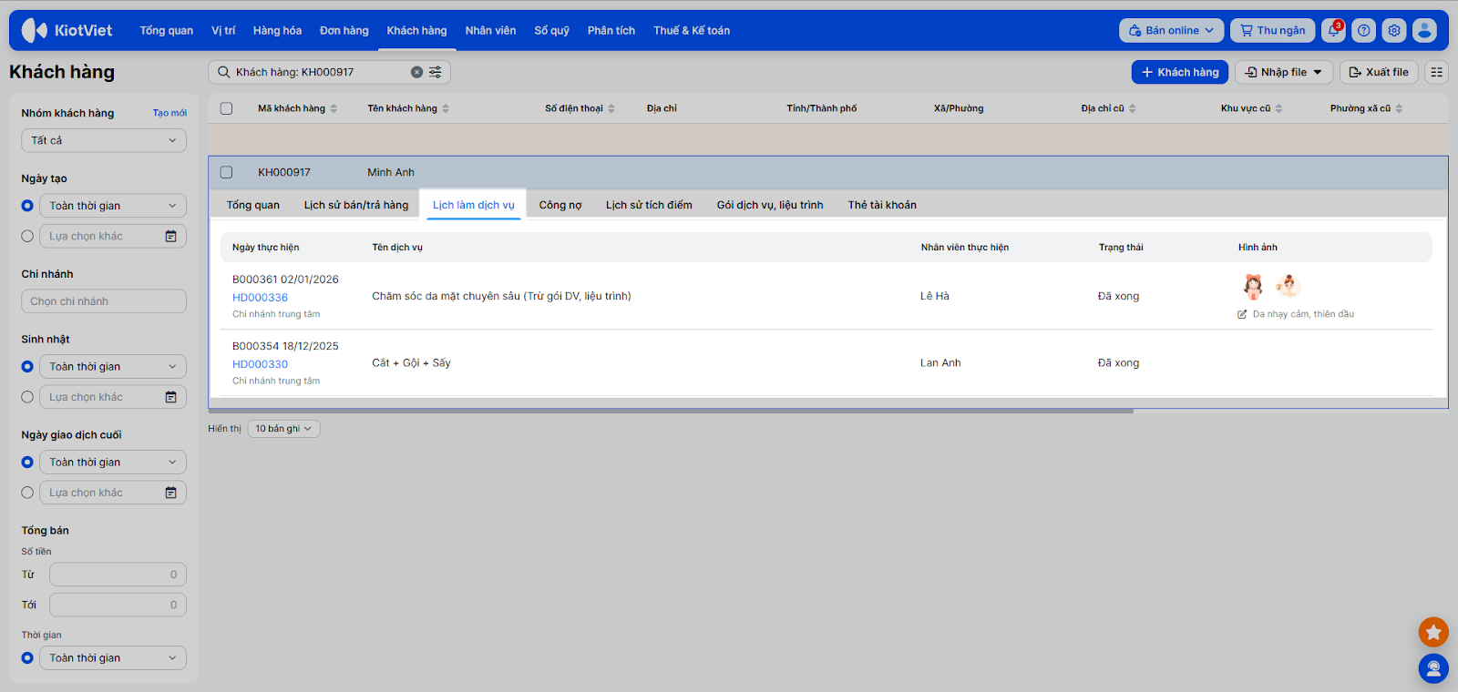 - Theo dõi lịch sử: Nắm bắt chi tiết từng lần khách đến làm dịch vụ hoặc mua hàng.