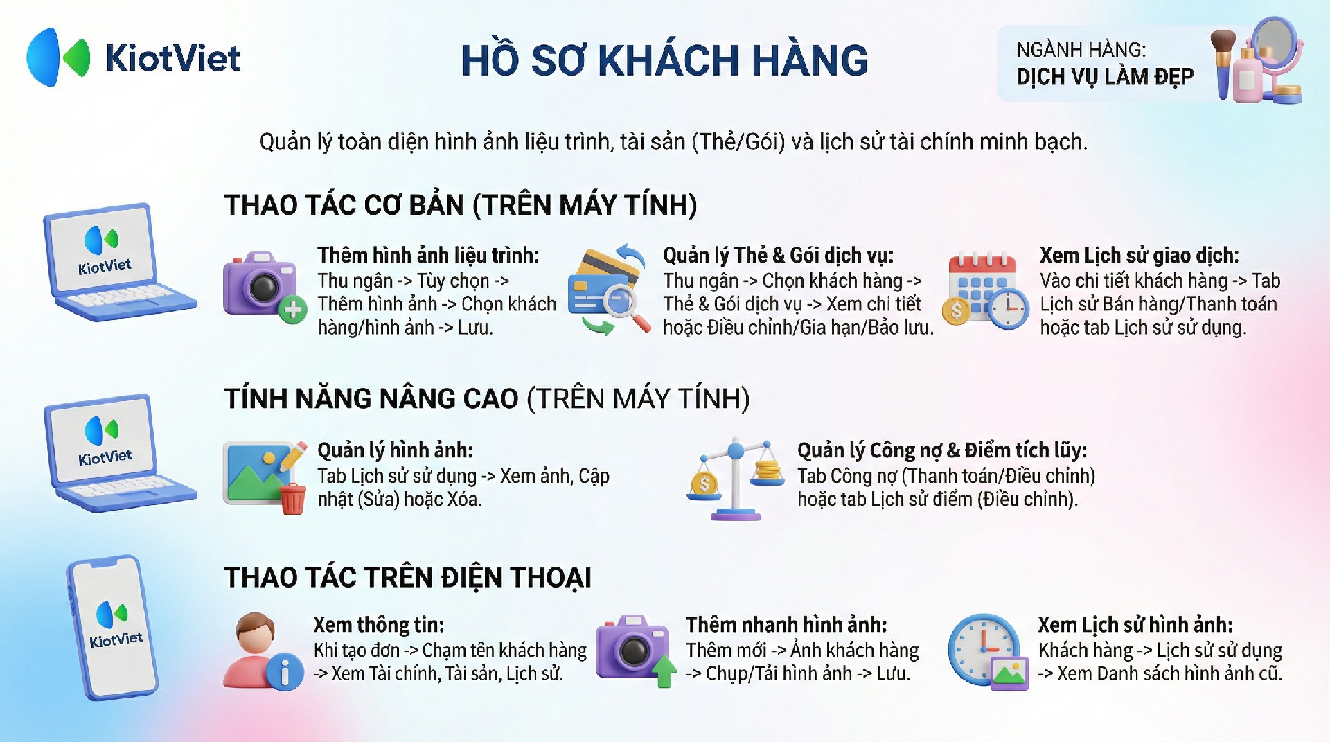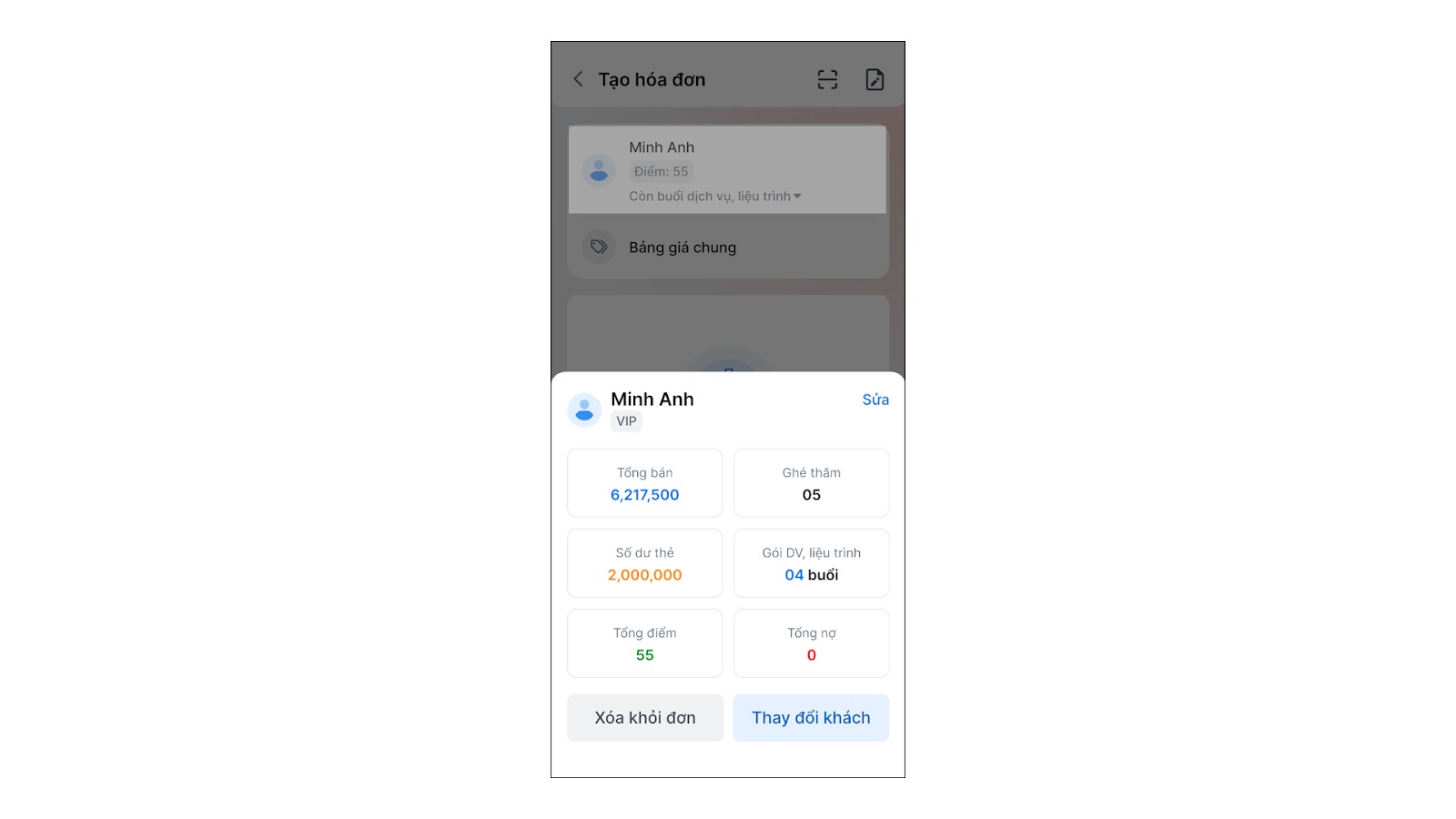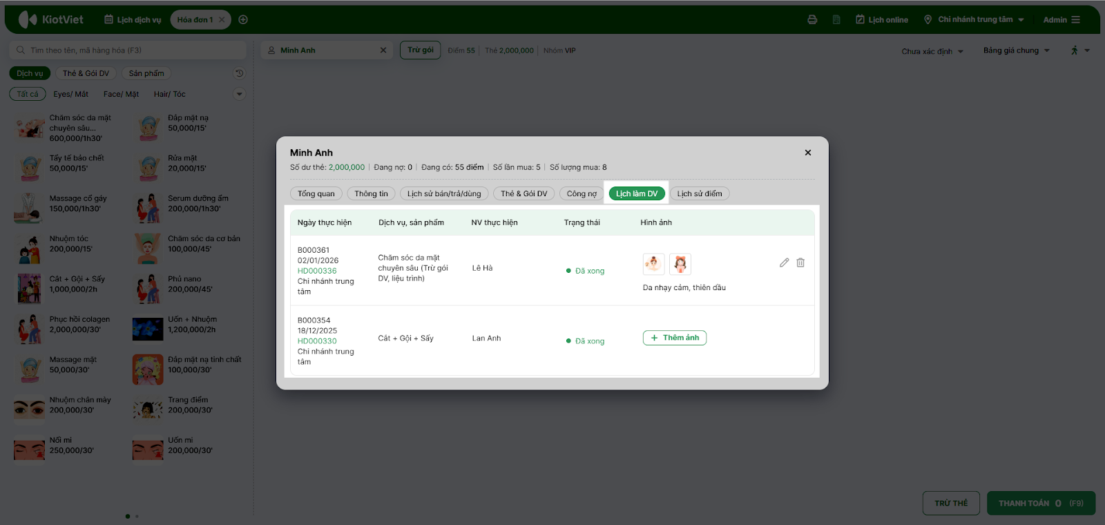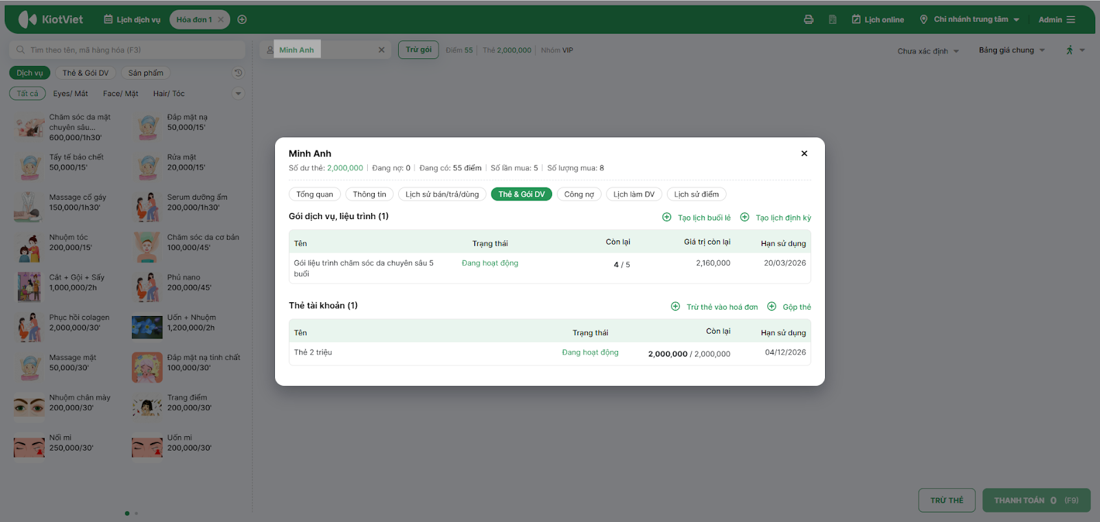 - Tài chính & Tài sản: Số dư thẻ, Tổng nợ, Tổng điểm, số buổi còn lại của Gói DV, liệu trình.