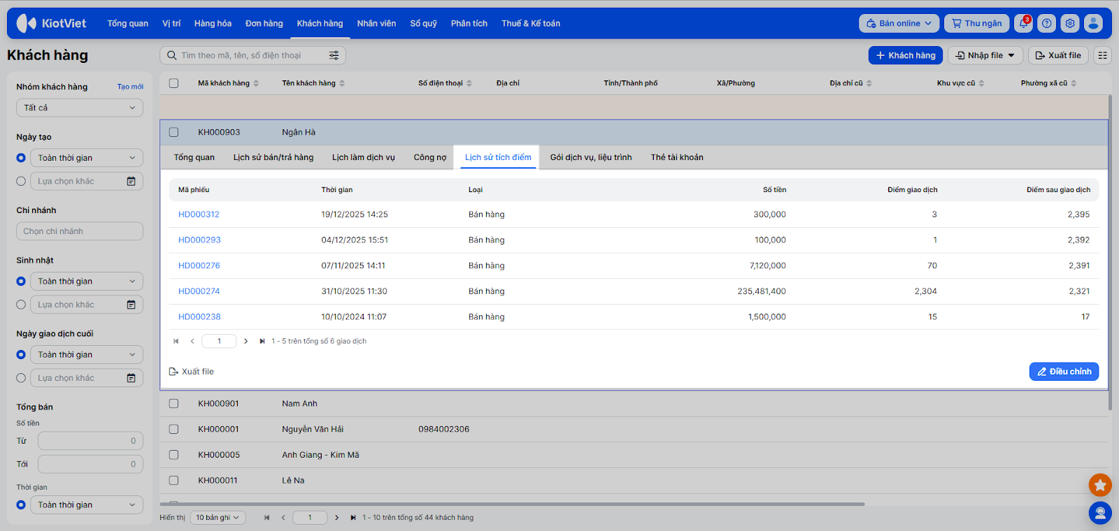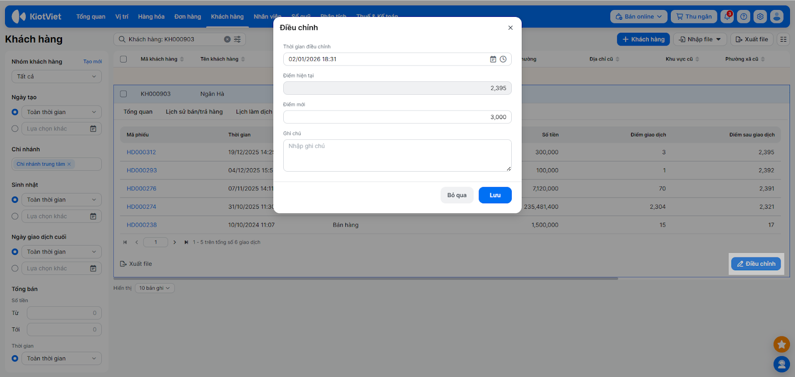 - Nhấn Điều chỉnh nếu bạn cần tặng/giảm điểm thưởng thủ công cho khách (Ví dụ: Tặng điểm nhân dịp sinh nhật hoặc đền bù khiếu nại).