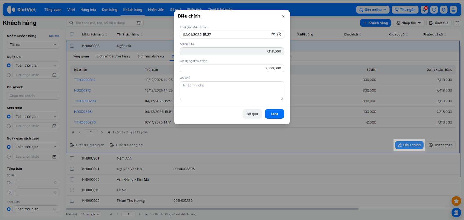 - Khi cần điều chỉnh lại công nợ, nhấn Điều chỉnh → nhập Giá trị nợ điều chỉnh tại thời gian đã chọn → nhấn Lưu.