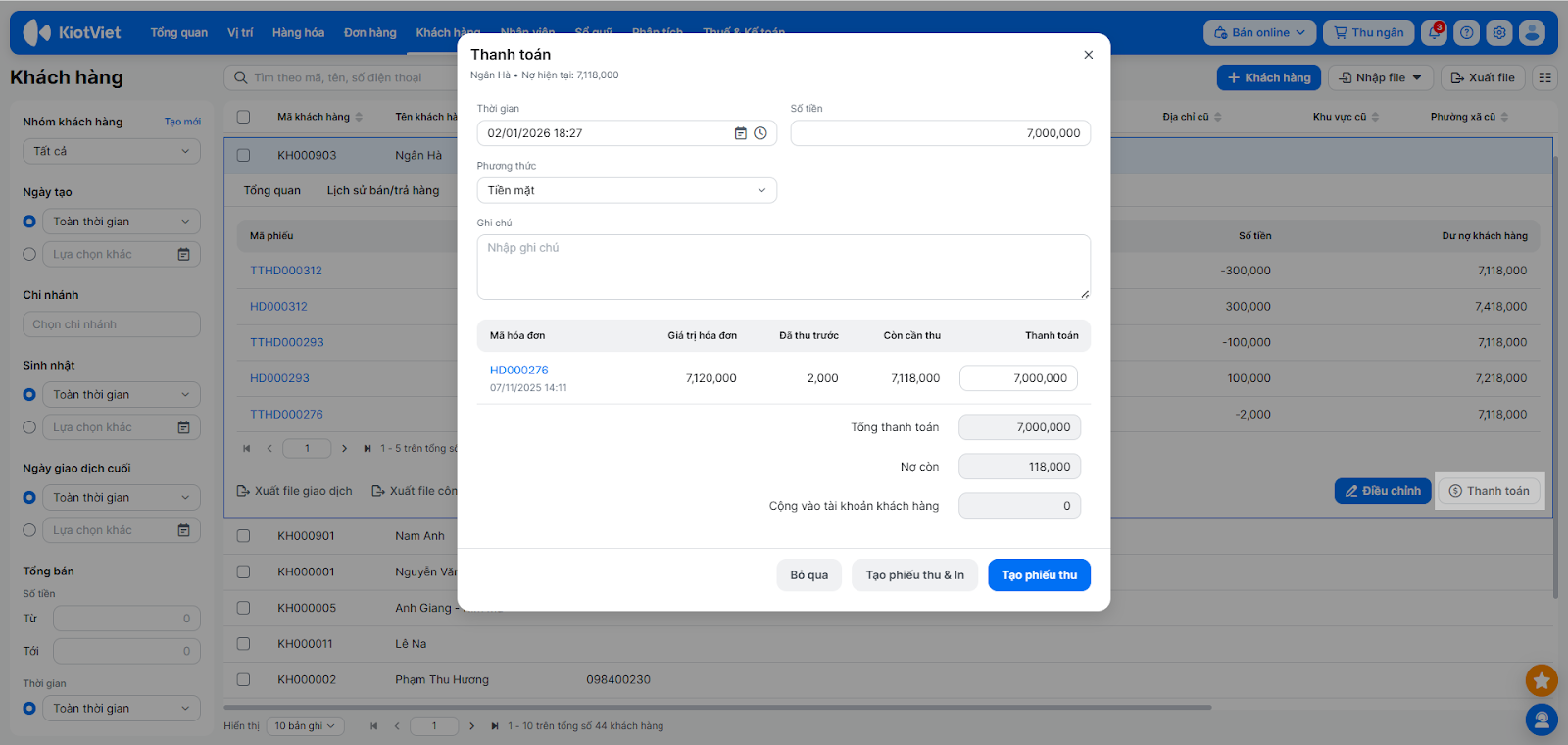 - Khi khách đến trả nợ, nhấn Thanh toán → nhập số tiền → Tạo phiếu thu để ghi nhận và trừ nợ.