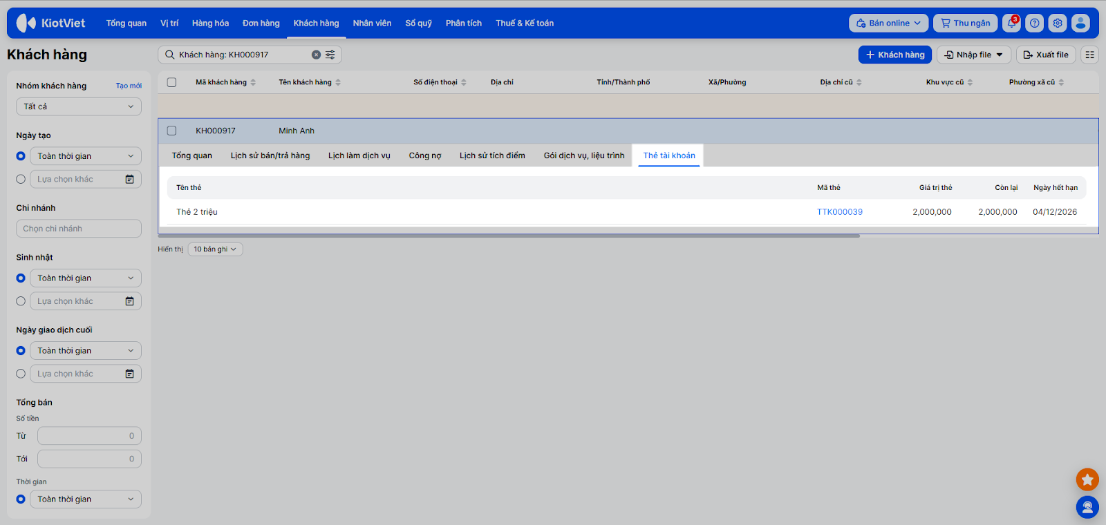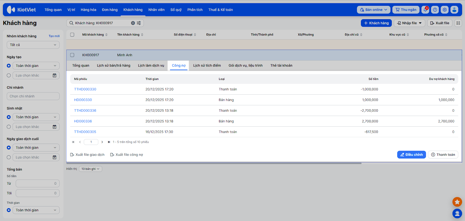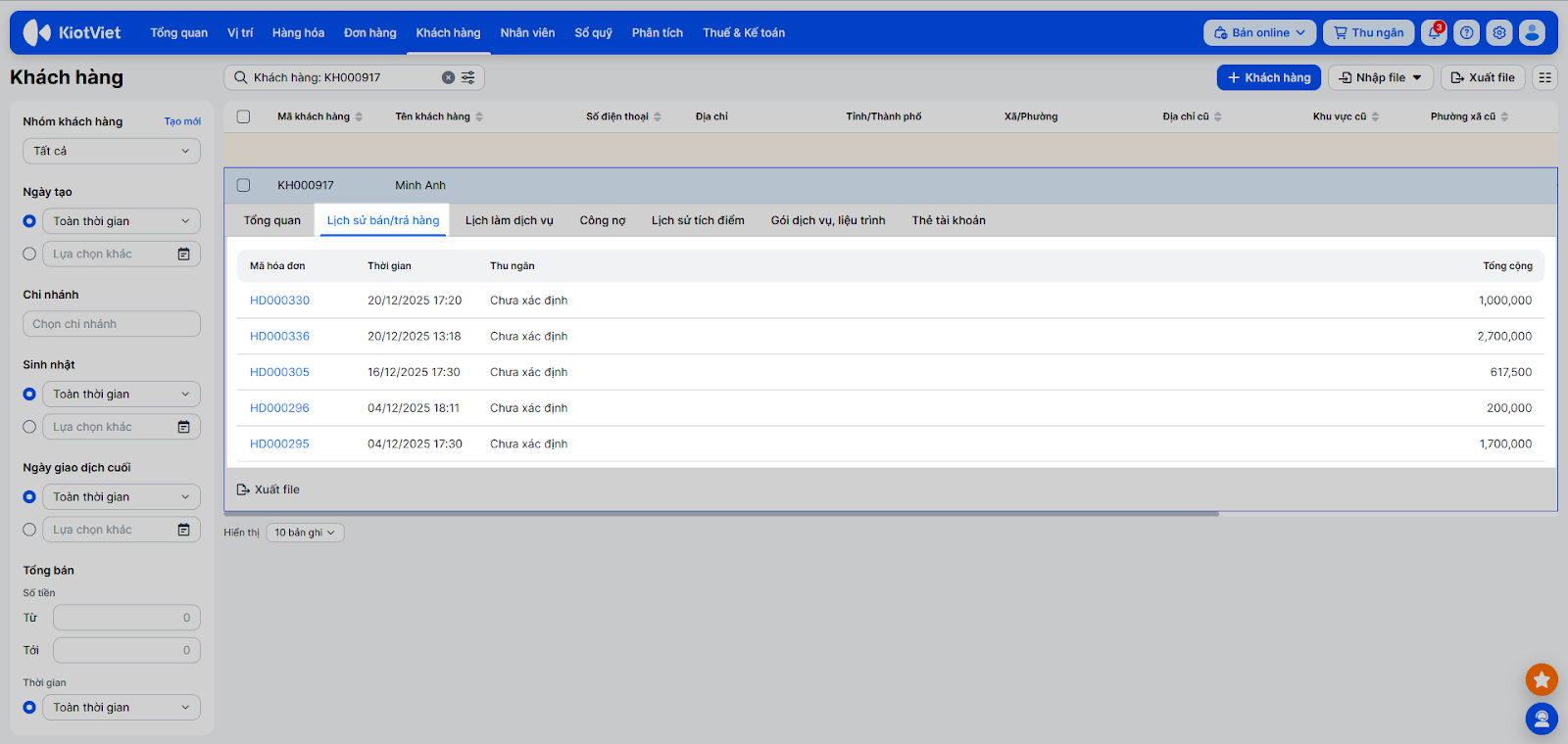 - Tại màn hình Quản lý → Khách hàng → Khách hàng → tìm kiếm và xem chi tiết khách hàng.