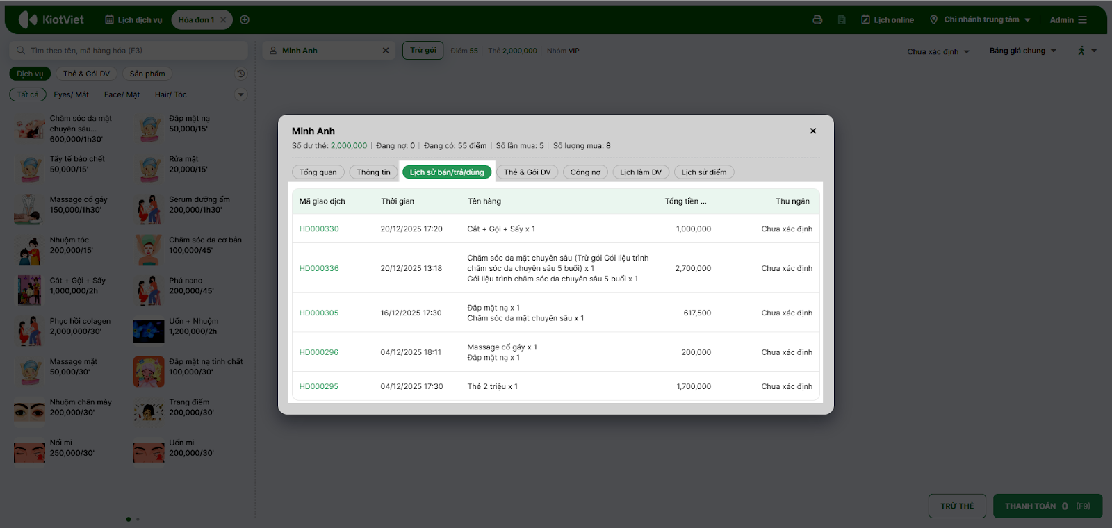 - Tab Lịch sử bán/trả hàng (Lịch sử bán/trả/dùng): Để xem toàn bộ danh sách hóa đơn khách đã mua (gồm mua lẻ, mua gói, mua thẻ…).