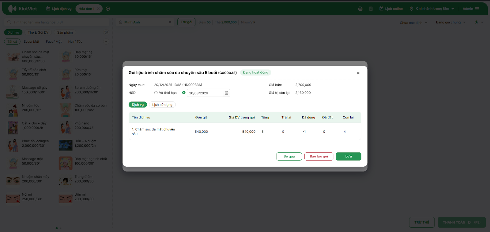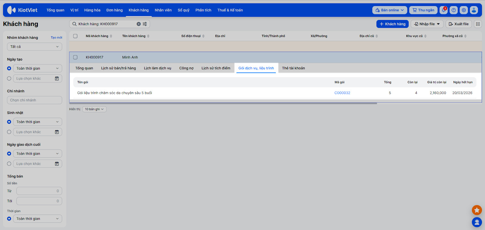 - Chọn tab Gói dịch vụ, liệu trình → hệ thống hiển thị thông tin gói dịch vụ, liệu trình của khách.