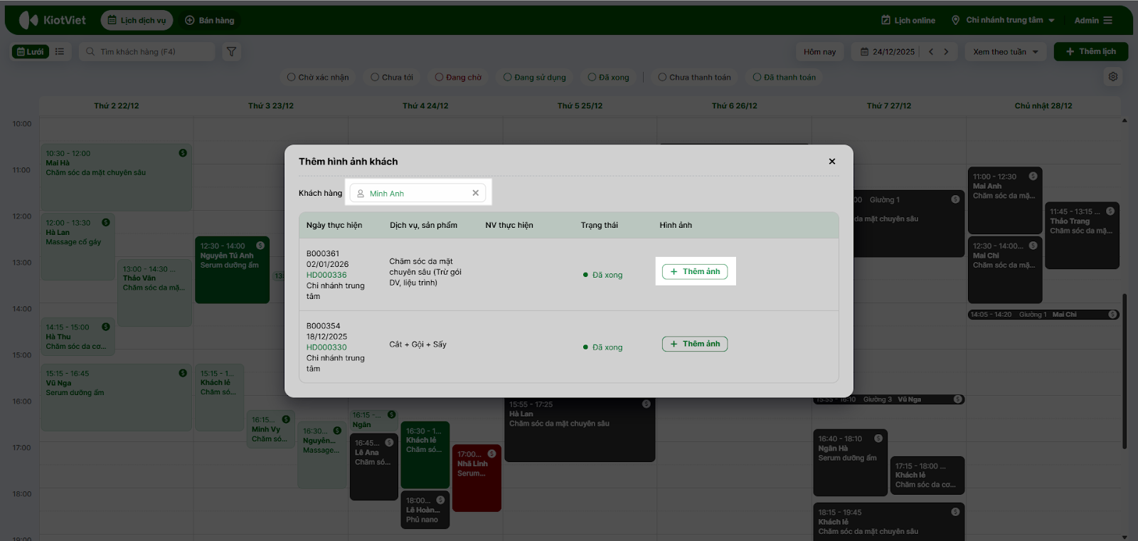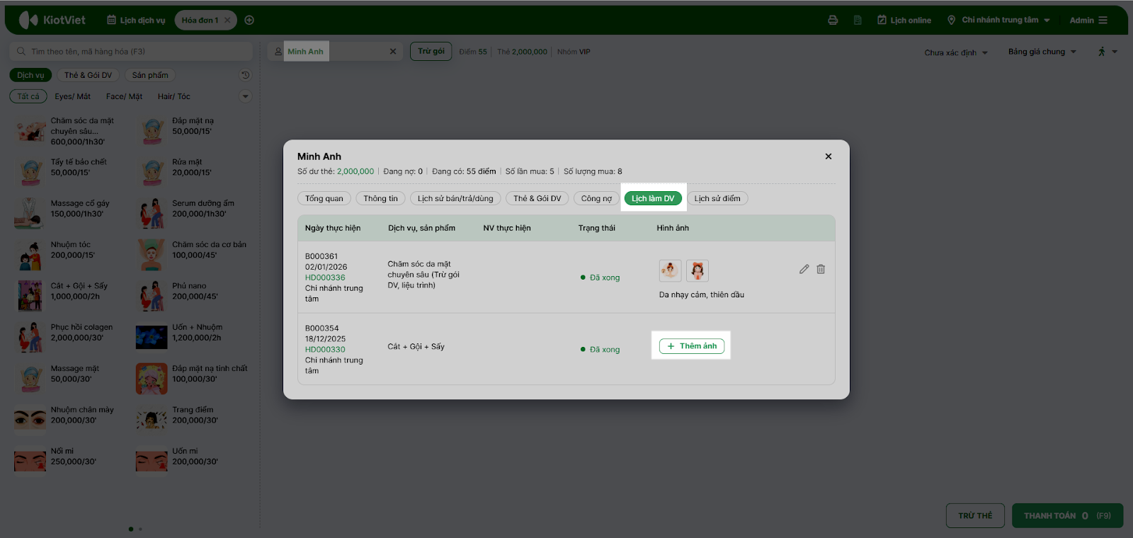 Ngoài ra, bạn có thể thực hiện thao tác thêm hình ảnh ngay khi xem chi tiết khách hàng trên màn hình Thu ngân bằng cách chọn tab Lịch làm DV và nhấn +Thêm ảnh.
