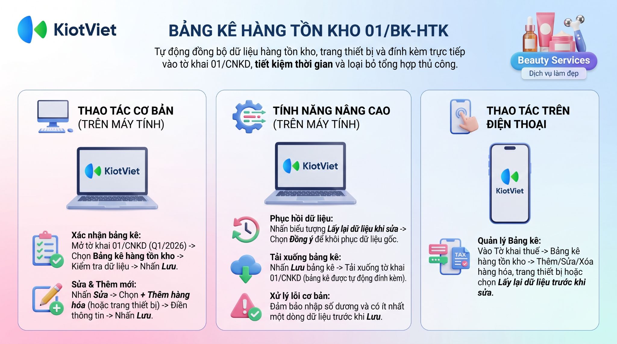 Bảng kê hàng tồn kho (01/BK-HTK) là một tiện ích được tích hợp trực tiếp bên trong tờ khai 01/CNKD trên hệ thống KiotViet. Tính năng này hỗ trợ các Hộ kinh doanh tự động tổng hợp số liệu về hàng hóa tồn kho cũng như các loại máy móc, thiết bị tại thời điểm cuối ngày 31/12 của năm tính thuế. Dữ liệu được trích xuất và trình bày tuân thủ nghiêm ngặt theo đúng mẫu biểu quy định hiện hành của cơ quan Thuế.