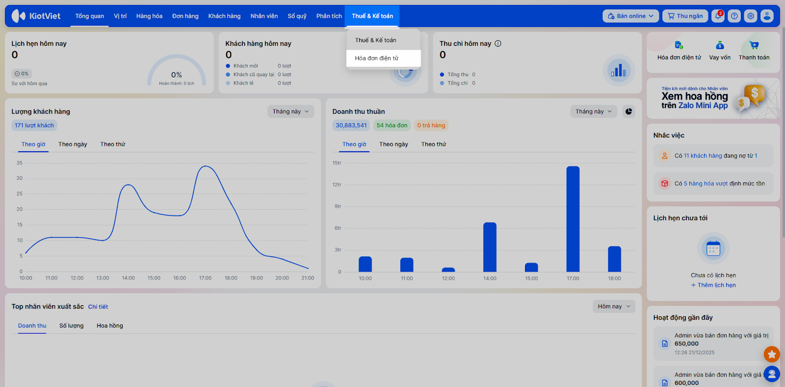 Tính năng này cho phép bạn kết nối và bắt đầu sử dụng Hóa đơn điện tử KiotViet ngay từ trong phần mềm quản lý bán hàng. Giải pháp này giúp cửa hàng xuất hóa đơn điện tử hợp pháp, đúng quy định của Bộ Tài chính mà không cần đăng ký tài khoản riêng biệt, đơn giản hóa quy trình vận hành.
