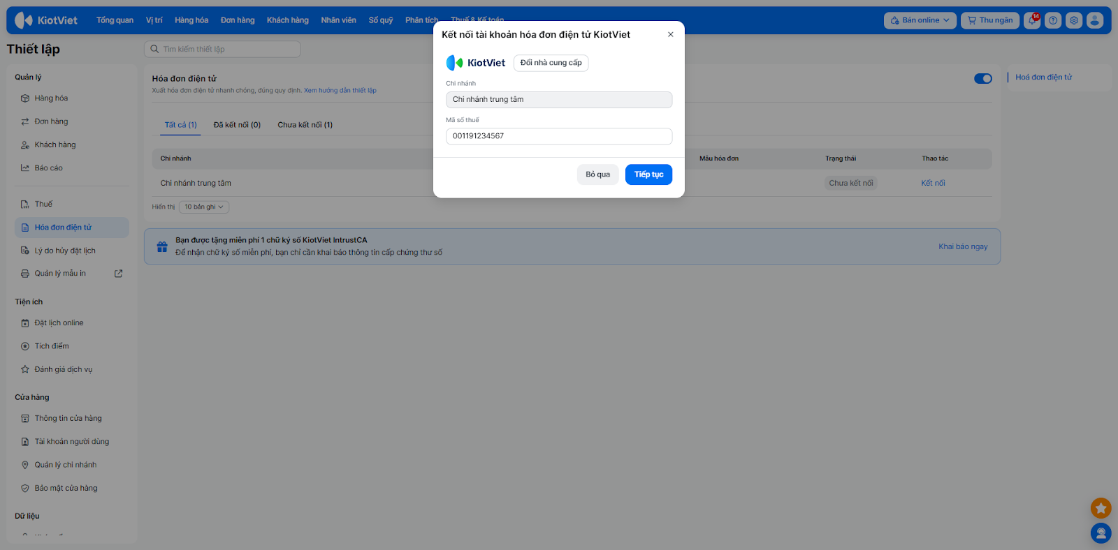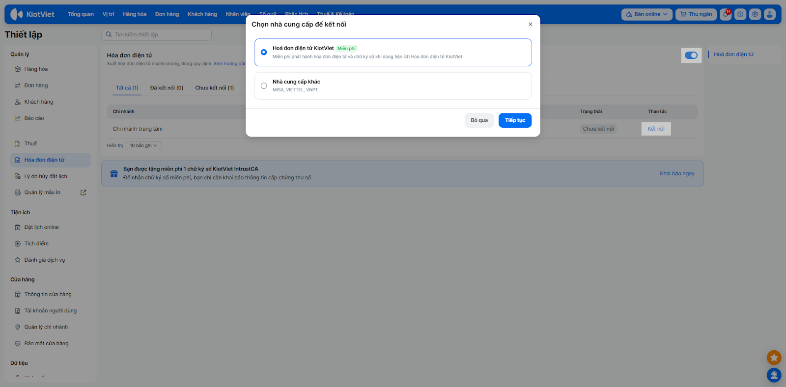 (2) Trong menu bên trái, chọn Hóa đơn điện tử, bật xanh tính năng → tại chi nhánh cần phát hành hóa đơn điện tử, nhấn Kết nối → chọn nhà cung cấp Hóa đơn điện tử KiotViet và nhấn Tiếp tục.