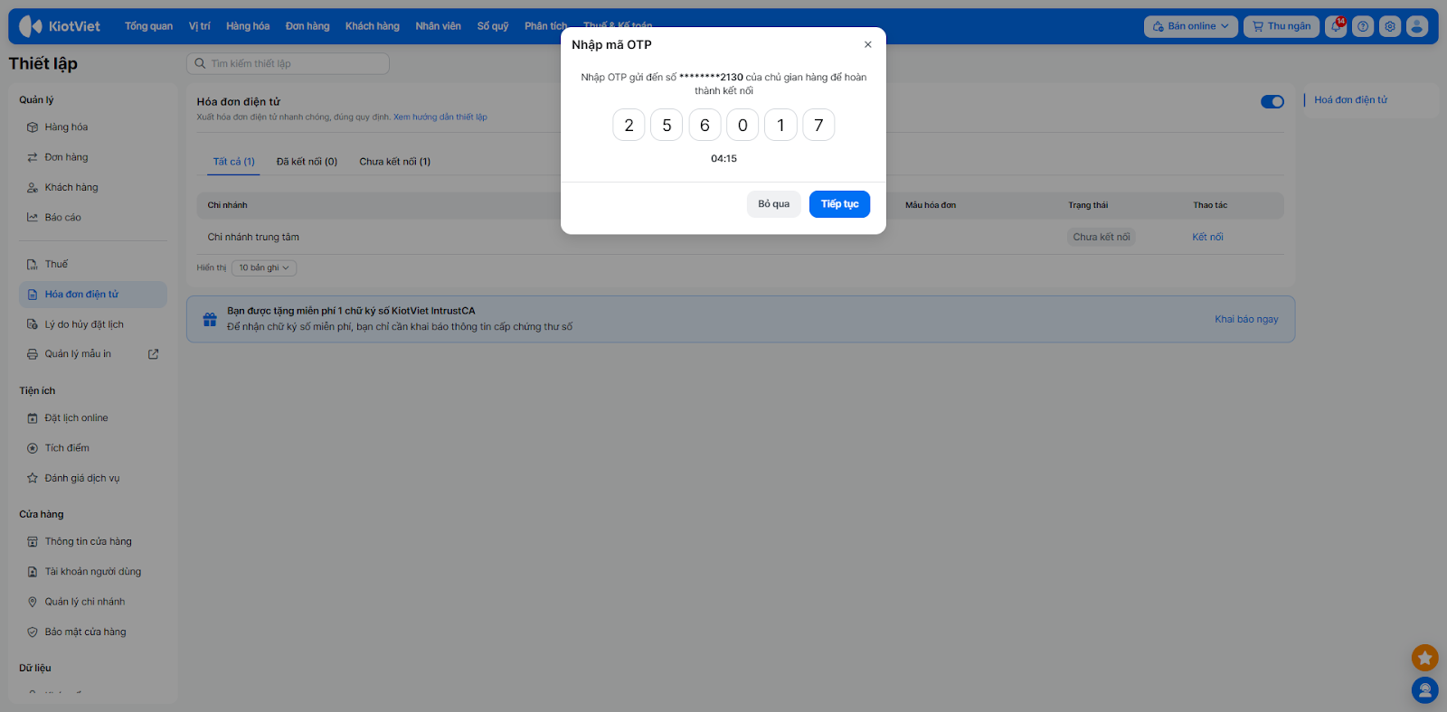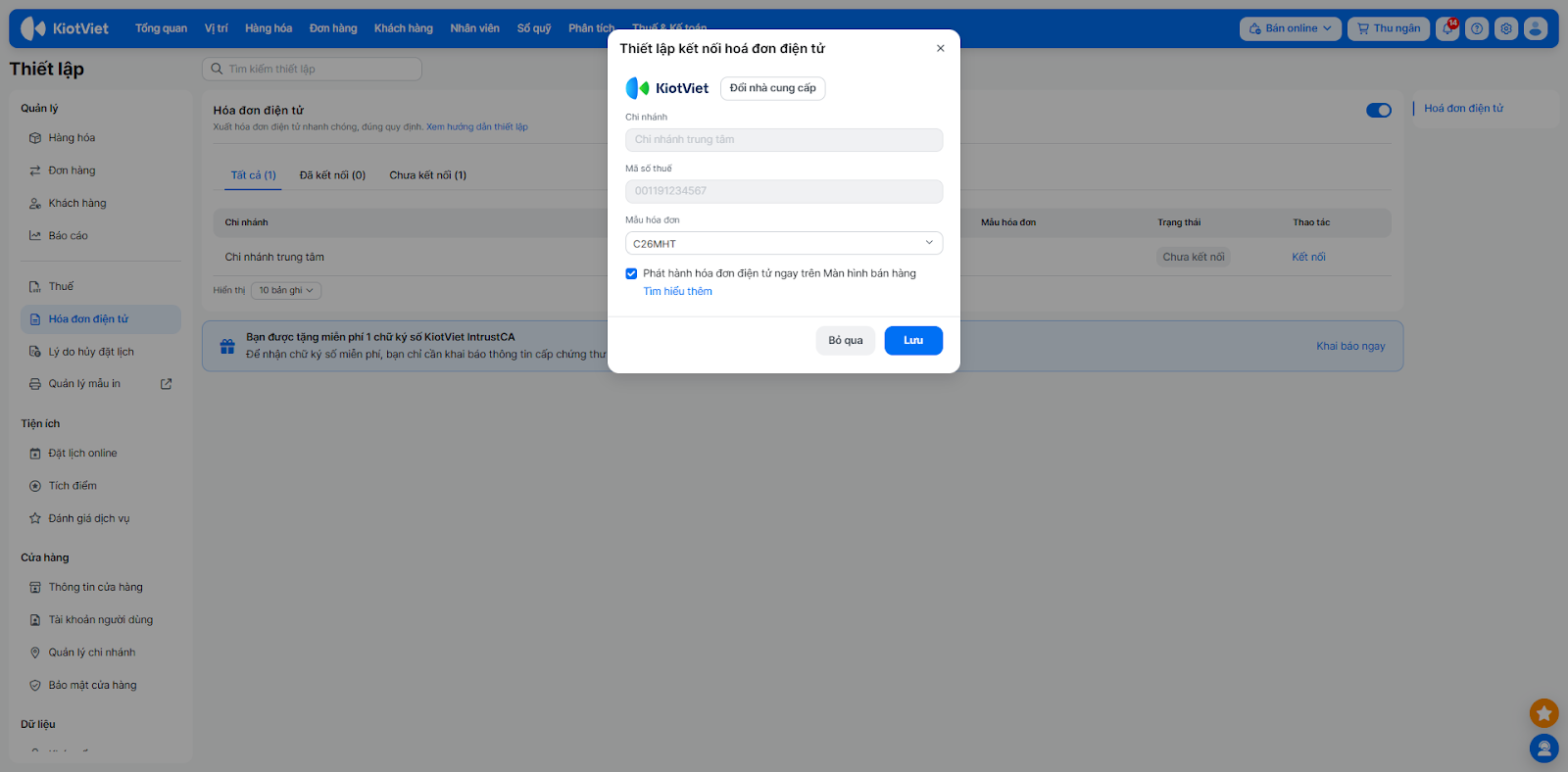 - Tình huống: Bạn là chủ cửa hàng và muốn hệ thống tự động xuất hóa đơn điện tử mỗi khi nhân viên hoàn tất đơn hàng, đảm bảo tuân thủ quy định thuế mà không tốn thêm thao tác thủ công. Bạn cần thực hiện kết nối Mã số thuế của cửa hàng với hệ thống KiotViet.