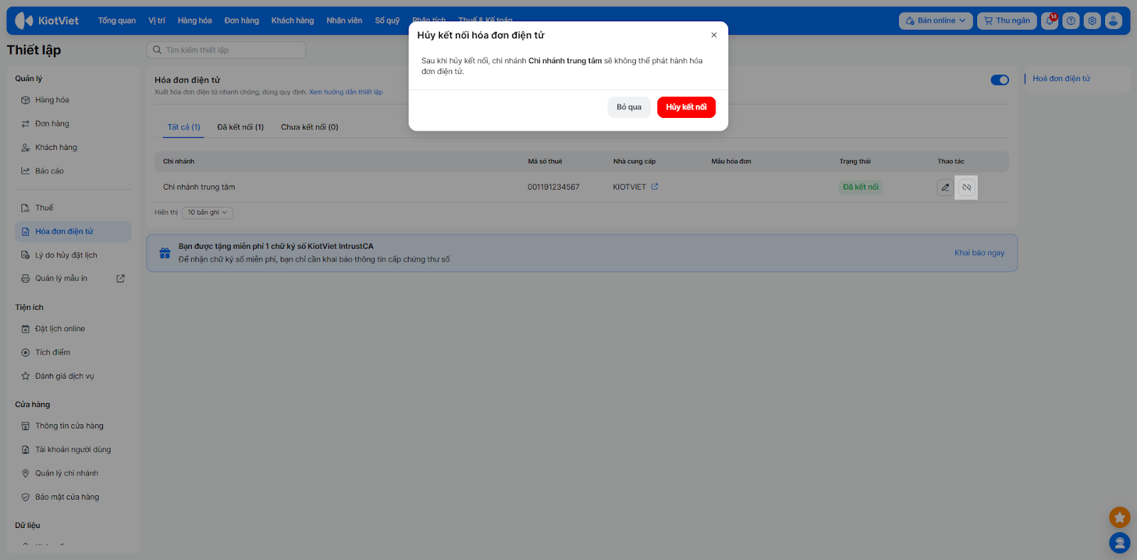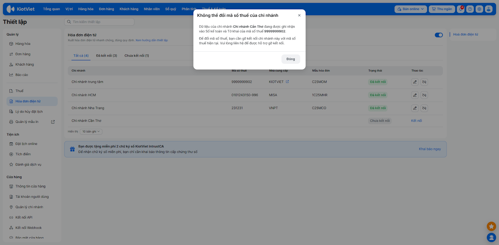 (2) Trong trường hợp này, bạn không thể tự thao tác. Vui lòng liên hệ tổng đài 1900 6522 để được nhân viên KiotViet hỗ trợ gỡ kết nối an toàn, đảm bảo tính toàn vẹn dữ liệu kế toán.