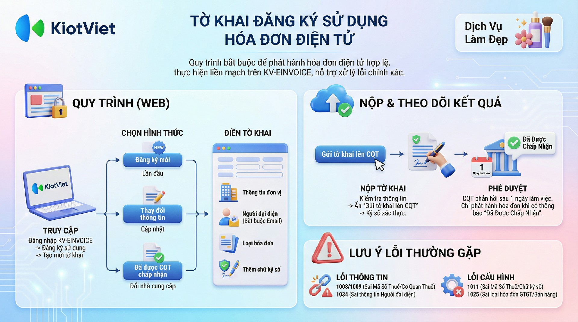 Nộp tờ khai đăng ký sử dụng hóa đơn điện tử là một bước pháp lý bắt buộc để doanh nghiệp/hộ kinh doanh được Cơ quan Thuế (CQT) chấp thuận và cấp phép phát hành HĐĐT. KiotViet đã tích hợp toàn bộ quy trình này ngay trên nền tảng KV-EINVOICE, cho phép người dùng khai báo thông tin, ký số và nộp tờ khai trực tiếp đến CQT một cách liền mạch và đúng chuẩn.