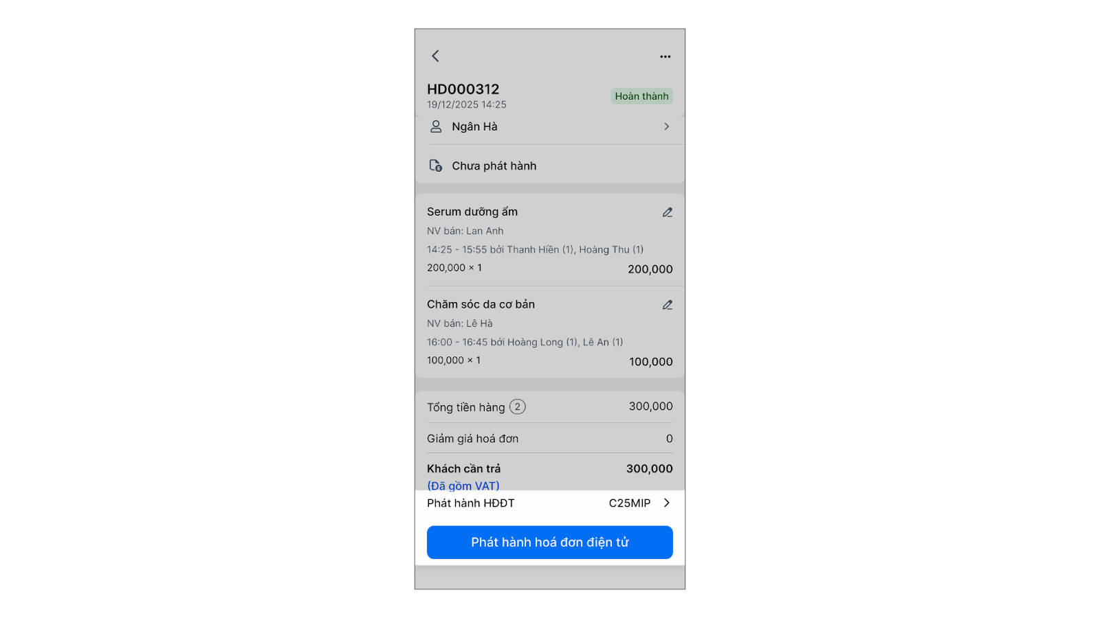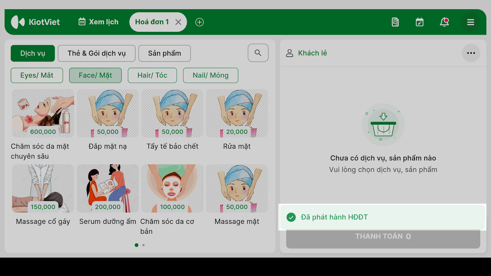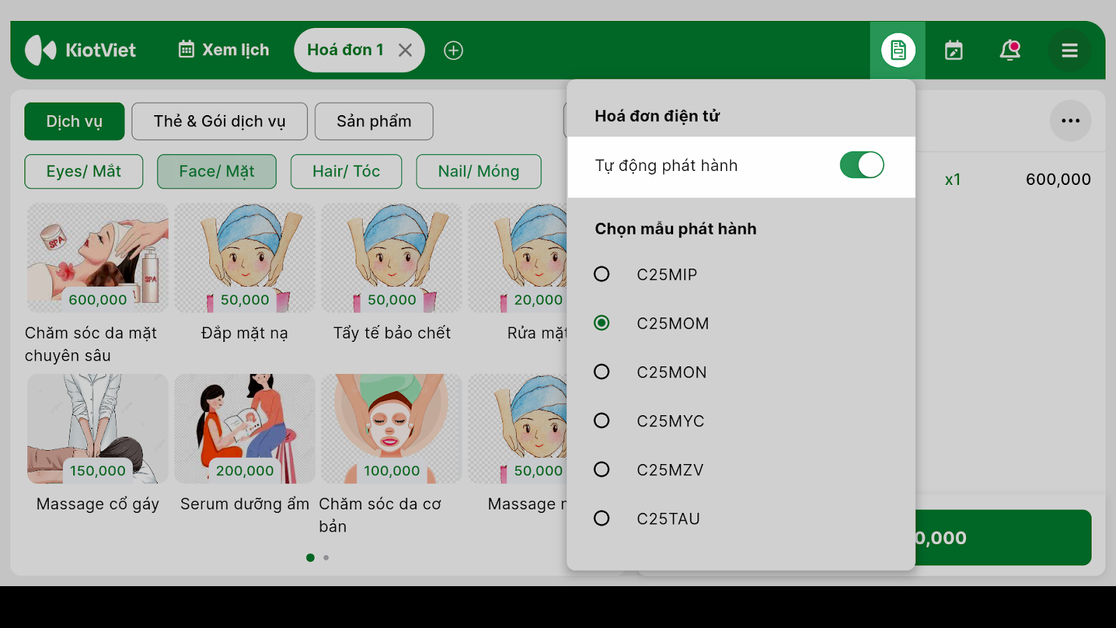- Tình huống: Khi bạn đang sử dụng ứng dụng di động KiotViet Salon để tạo đơn và thanh toán cho khách, bạn muốn hóa đơn điện tử được phát hành tự động ngay khi giao dịch hoàn tất.