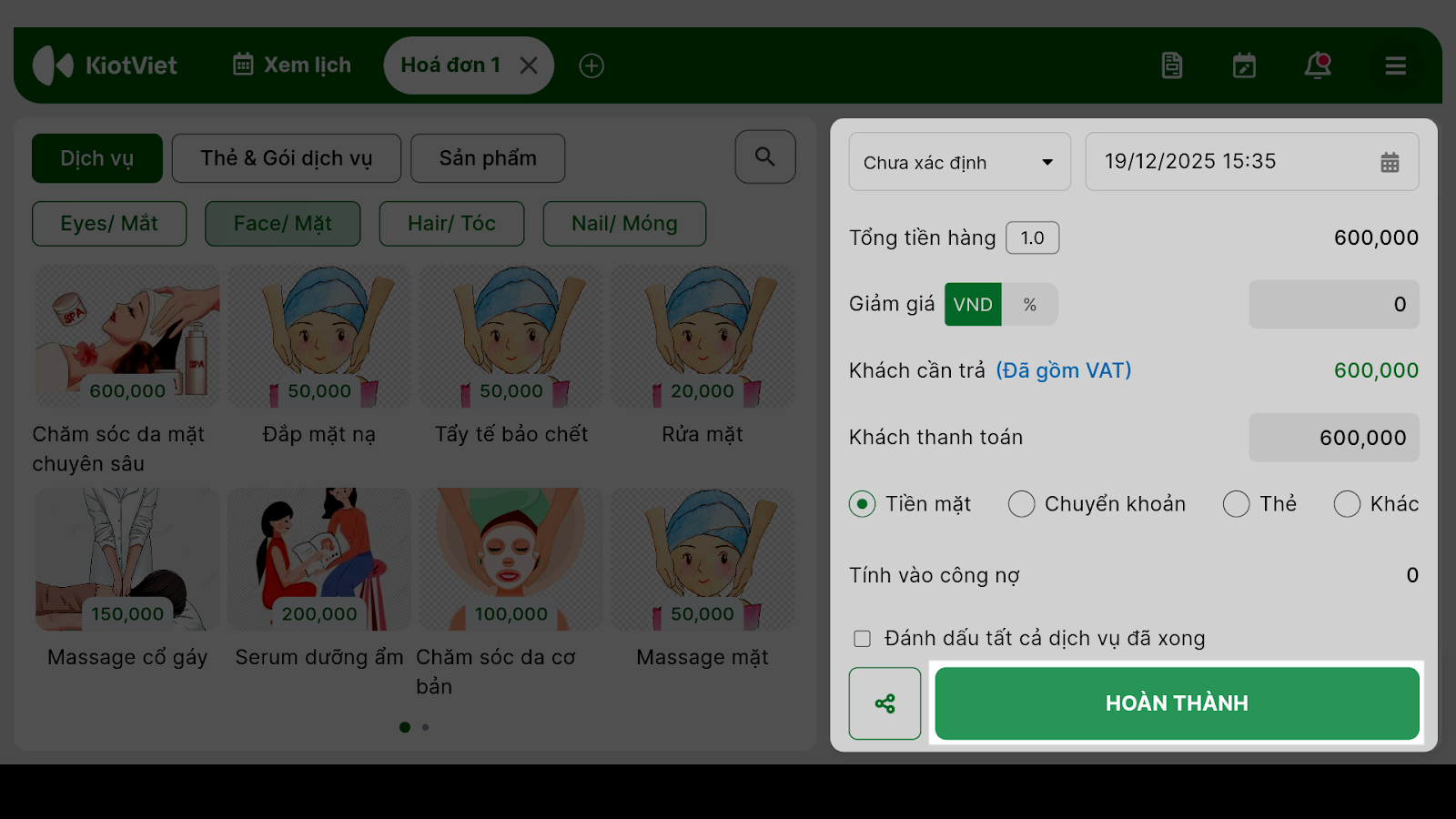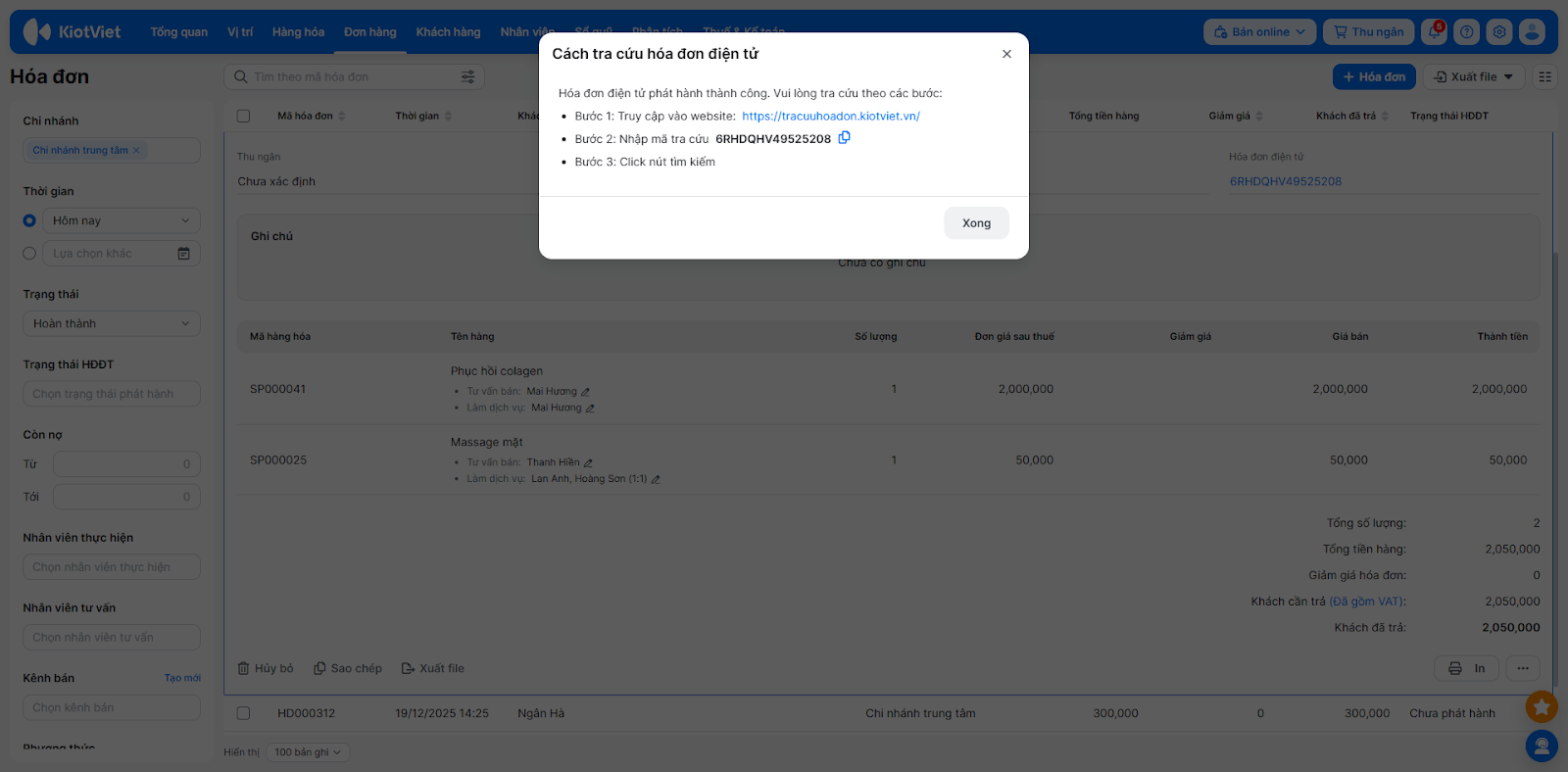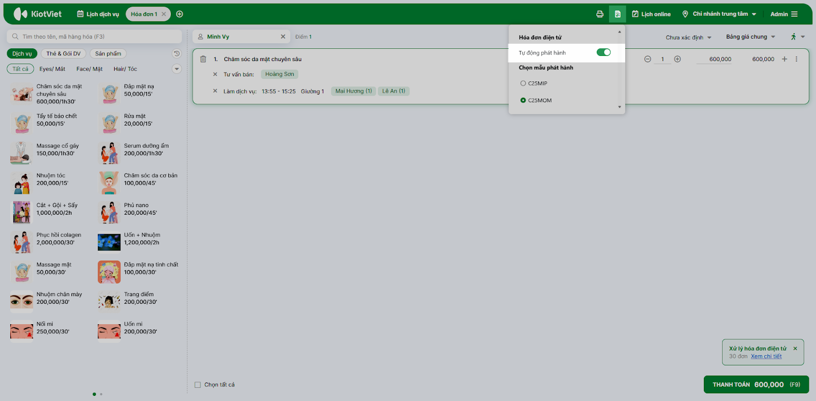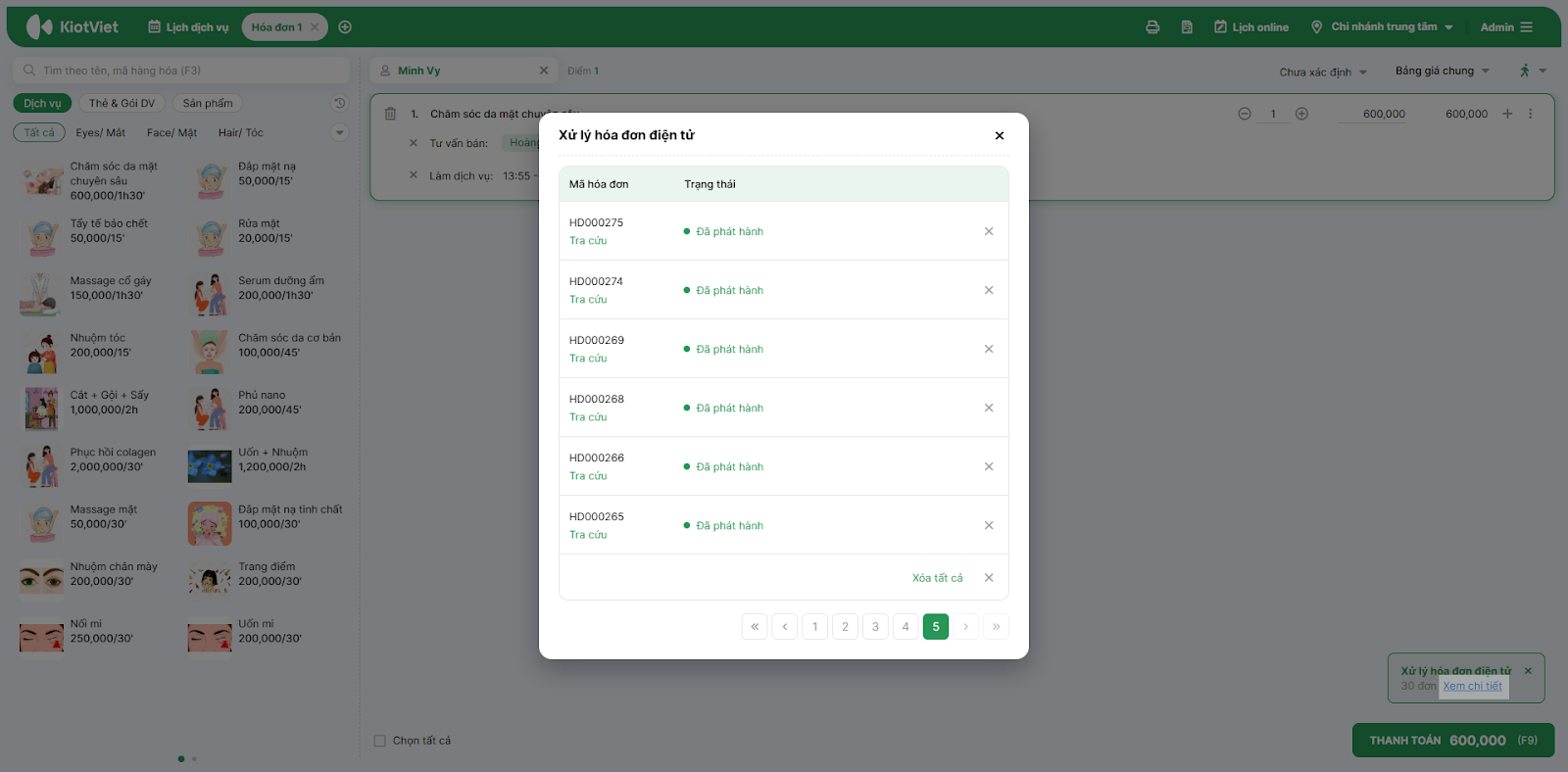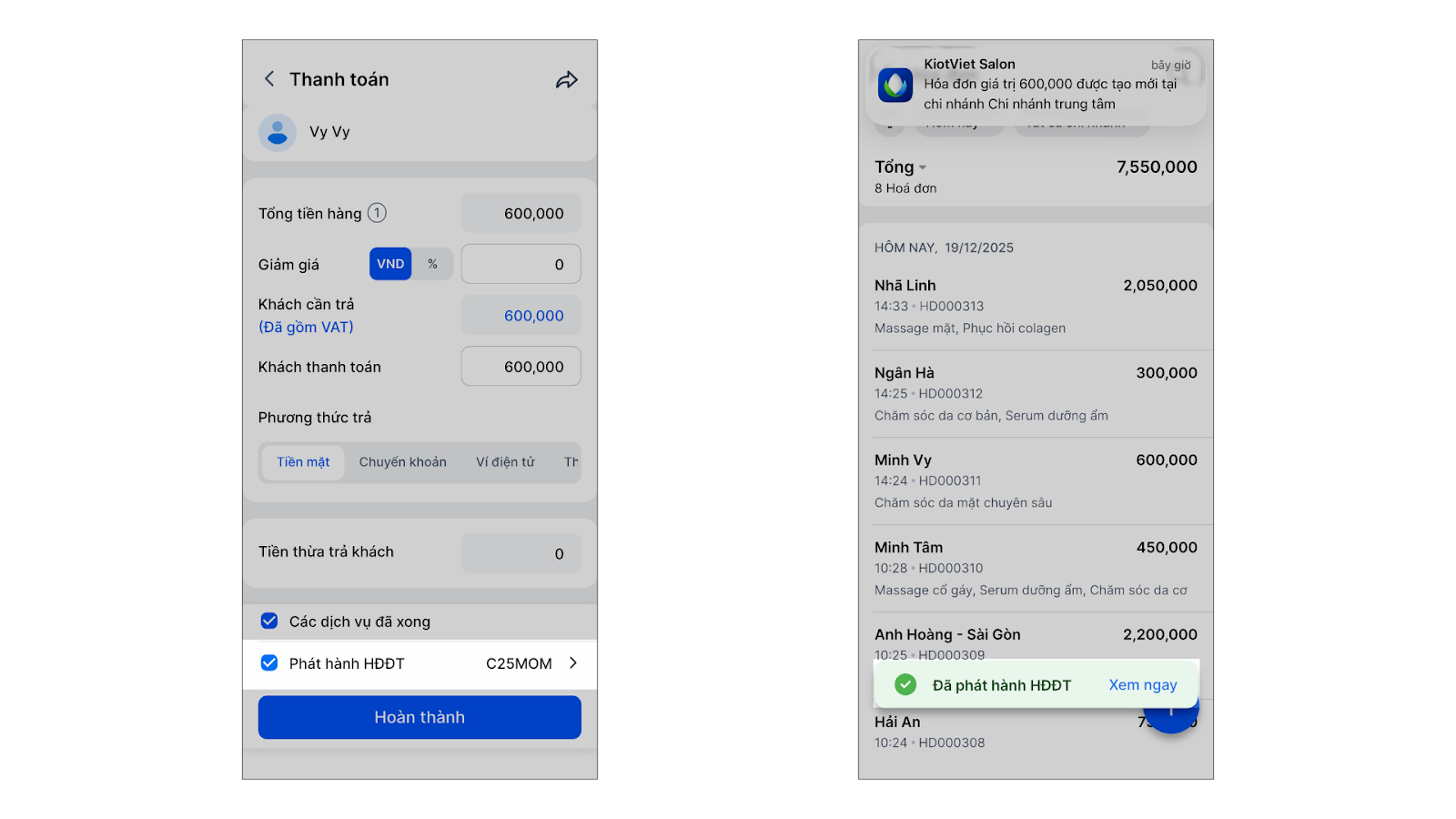 - Chủ động và linh hoạt 24/7: Giúp chủ salon, spa chủ động trong việc lập hóa đơn hoặc xử lý các sai sót ngay khi có phát sinh giao dịch (thanh toán bill), bất kể thời gian nào.