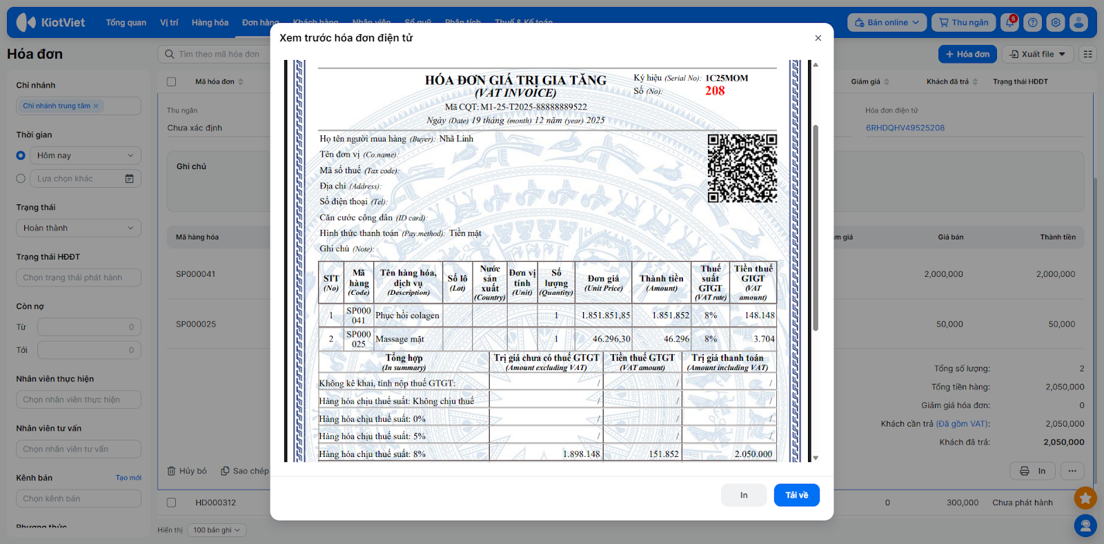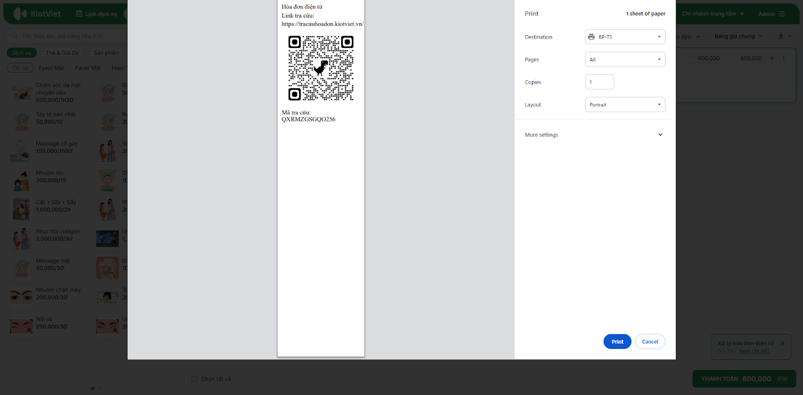 - Tại đây, bạn có thể In hóa đơn (bao gồm mã QR và mã tra cứu).